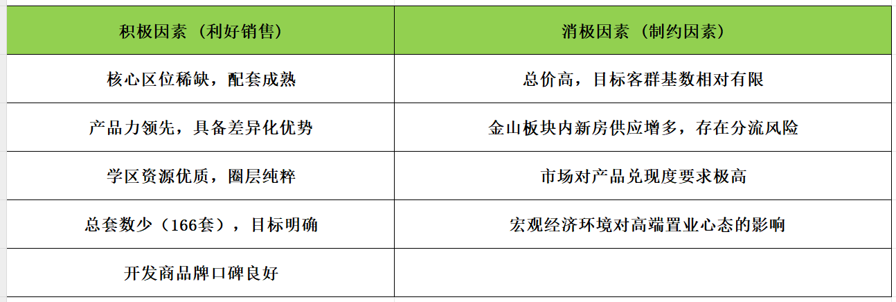 因此,尽管面临市场竞争和高端客群获取的挑战,但凭借其不可复制的核心价值,建总·瑞玺在金山核心区销售前景看好,预计能成功吸引目标客群并实现稳健去化。