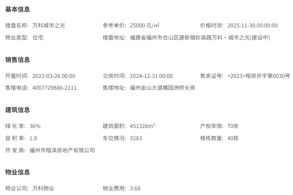 万科城市之光由福州市榕泽房地产有限公司开发。作为万科体系的一员,开发商秉承了万科集团一贯的精工品质和严谨态度,确保了项目的高标准建设。