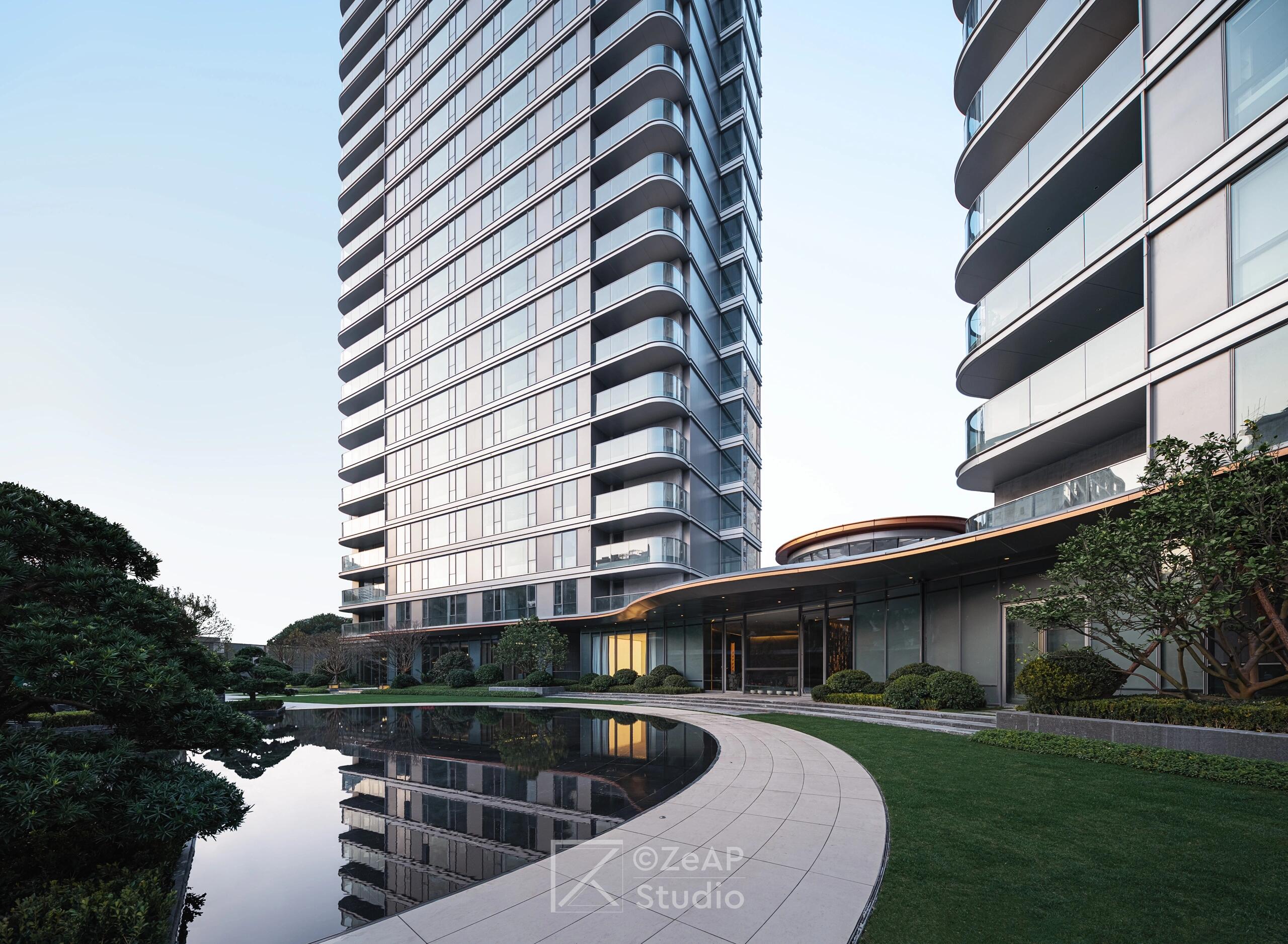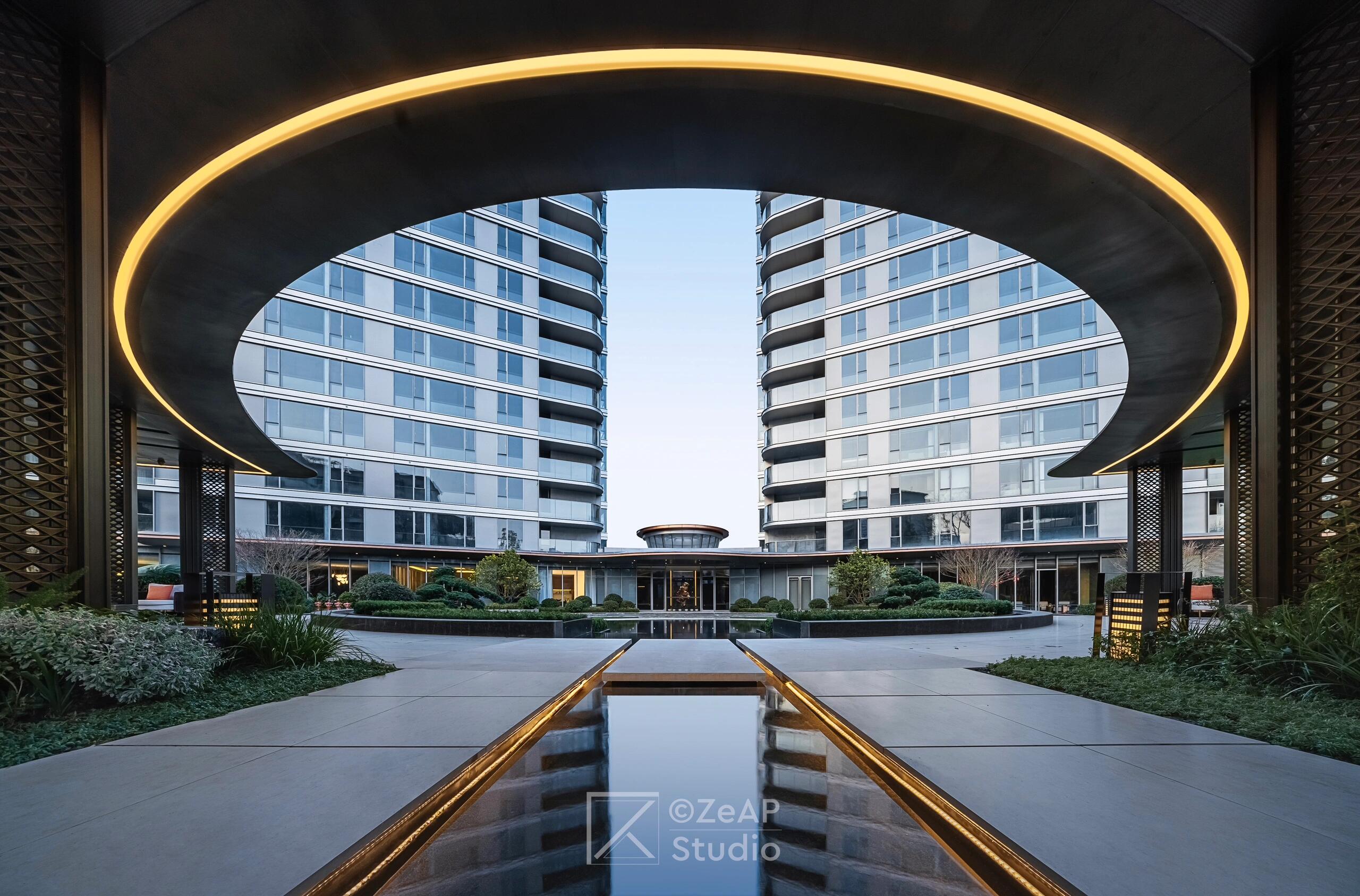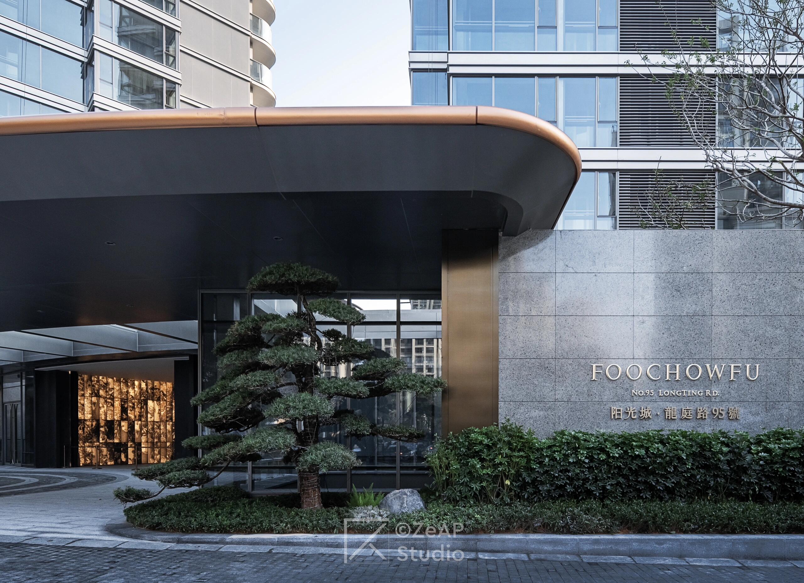 最引人注目的是双塔顶部通过连廊相连,形成“福州之眼”的景观效果,这一设计灵感来源于福州三坊七巷的坊门、巷门文化。项目入口设计宏伟壮观,拥有60米超宽门头界面和45米长的弧形大挑檐,电动双开铜门采用三重蚀刻的精雕工艺,营造出强烈的仪式感和尊贵感。