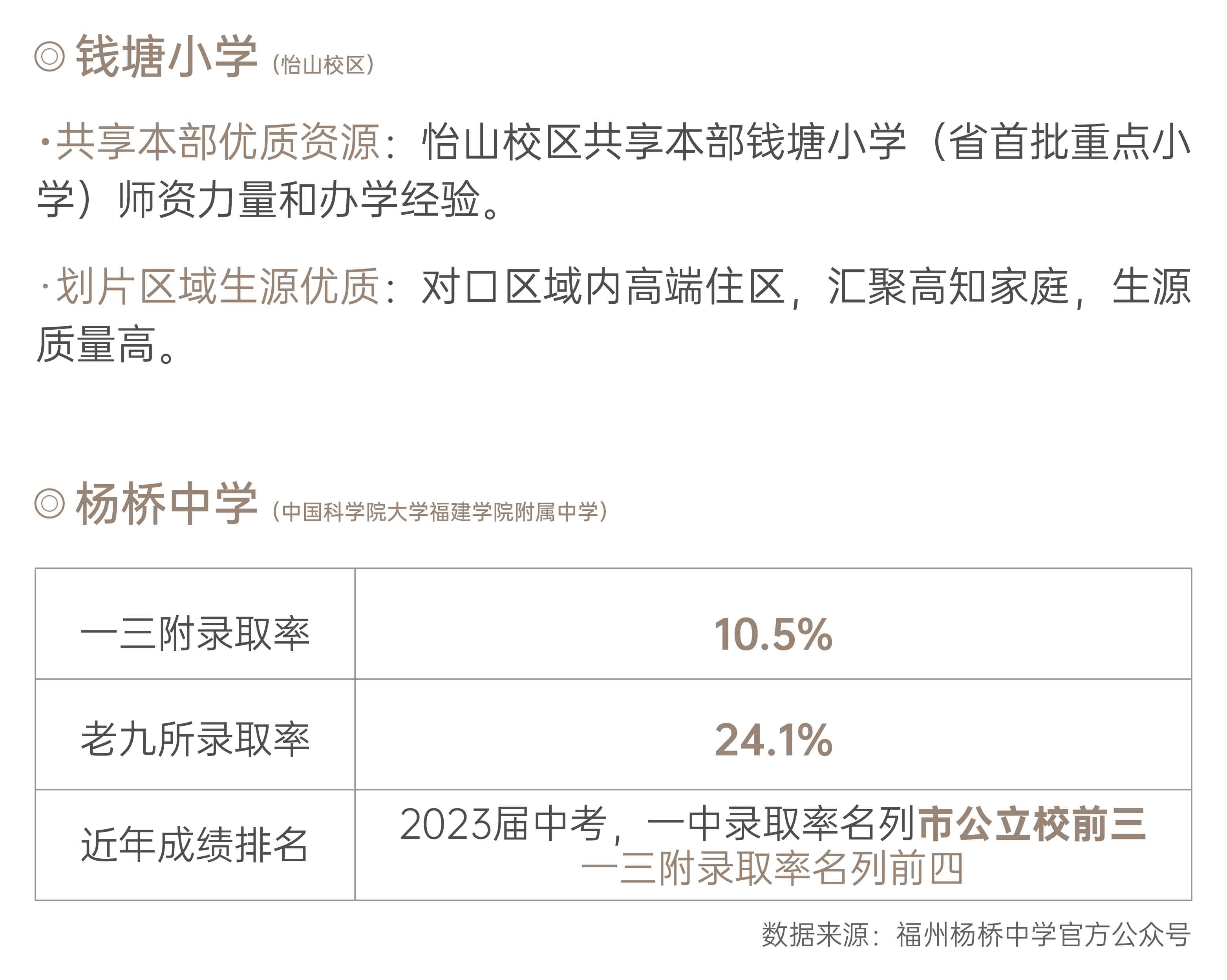 钱塘小学作为福建省示范小学,其教育质量与管理模式在福州家喻户晓。杨桥中学作为中国科学院大学福建学院附属中学,近年中考成绩优异,“一三附”录取率名列市公立校前列。