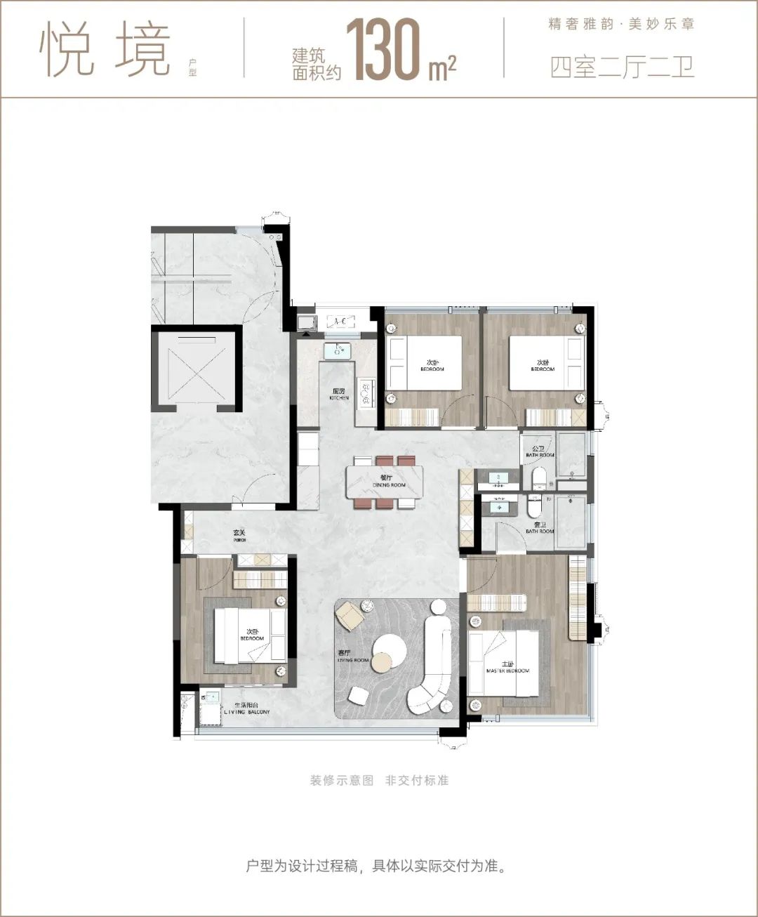 130㎡户型:采用四叶草布局,LDKG一体化家庭聚场,7.3米南向观景舱,270°沉浸式广角窗。