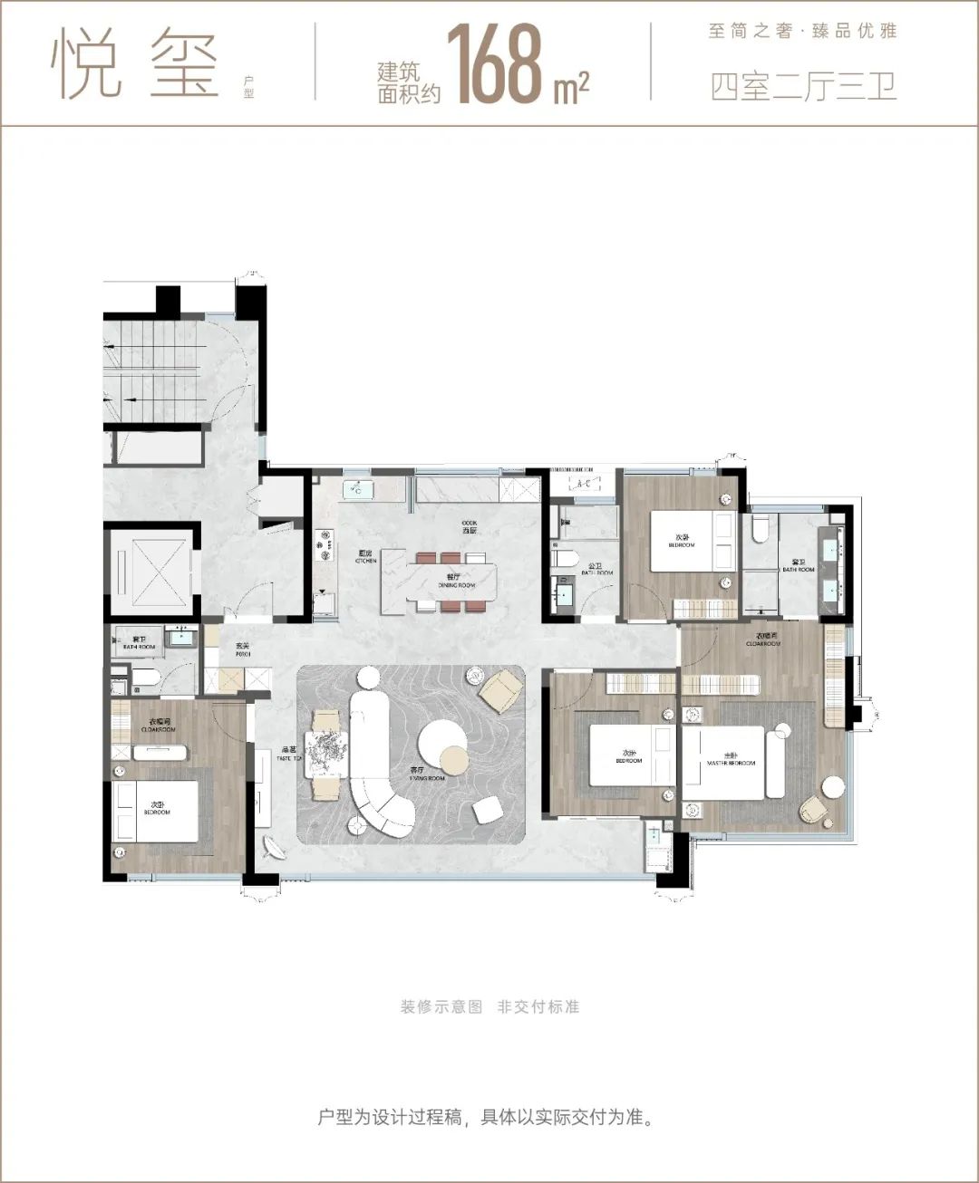 168㎡户型:独立电梯厅入户,7.2米阔景奢厅,配备约10米的观景跑道阳台,三卫布局适合多代同堂。