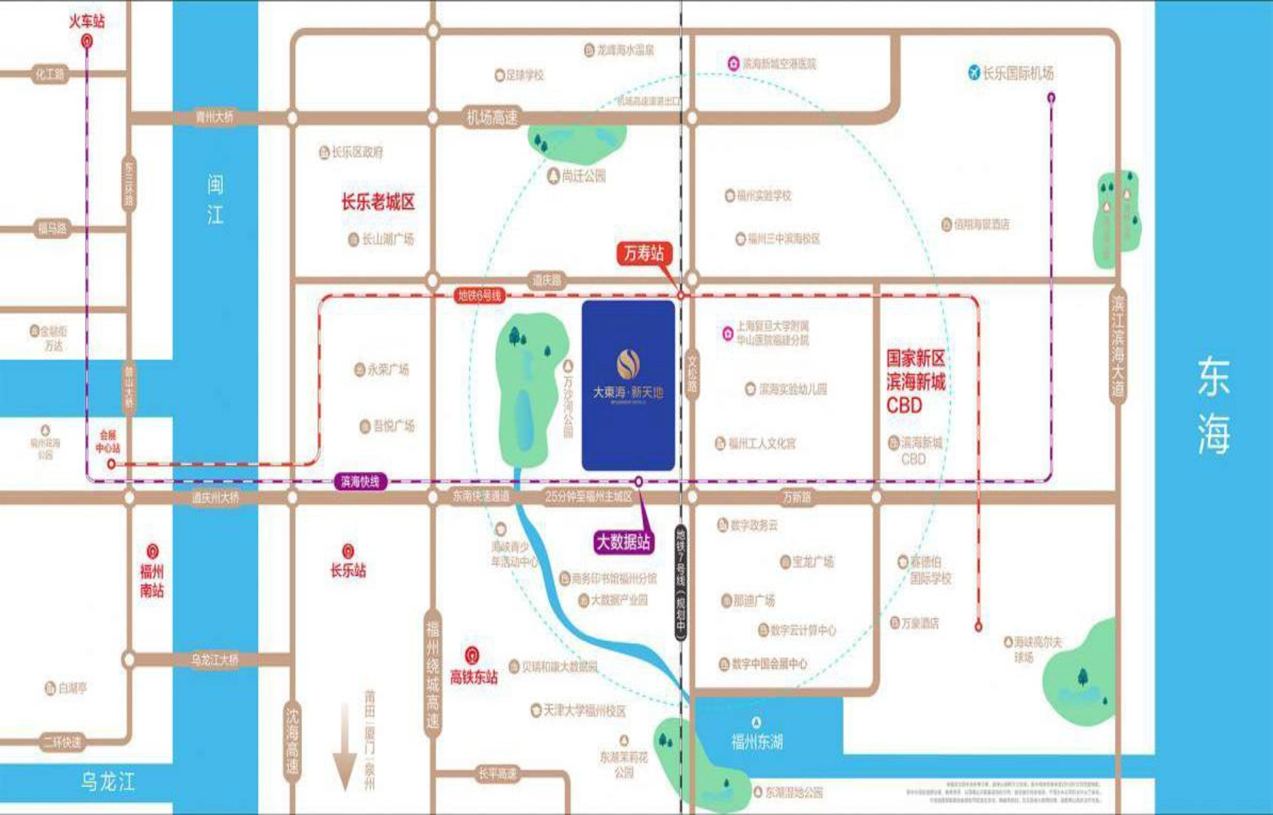 项目毗邻东海大道,距福州长乐国际机场约15公里,距福州火车站约35公里,未来可通过滨海快线(在建)连接福州市区。