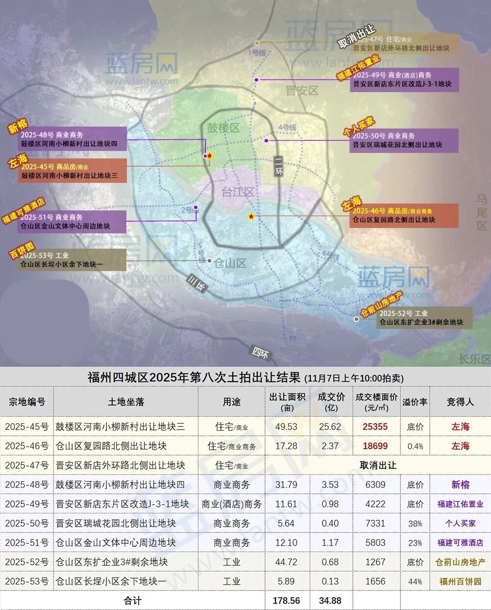 福州新榕筑业工程有限公司以底价3.53亿元竞得小柳地块的商服用地;福建可雅酒店有限公司以1.17亿元竞得仓山区金榕南路的一幅商服用地,溢价率23.16%;个人竞买人陈祥琳以4000万元竞得晋安区长乐北路东侧的一幅商服用地。