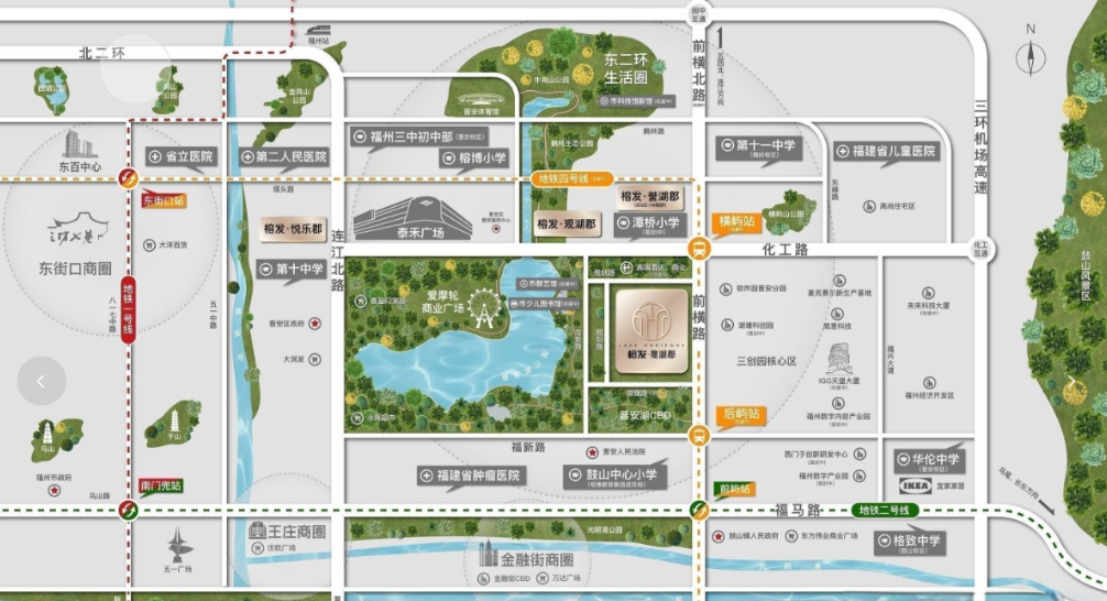 榕发誉湖坐落于福州晋安前横路与安铺路交叉口西60米,占据东二环心脏地带,项目周边配套成熟完善,真正实现了出则繁华、入则宁静的生活场景。