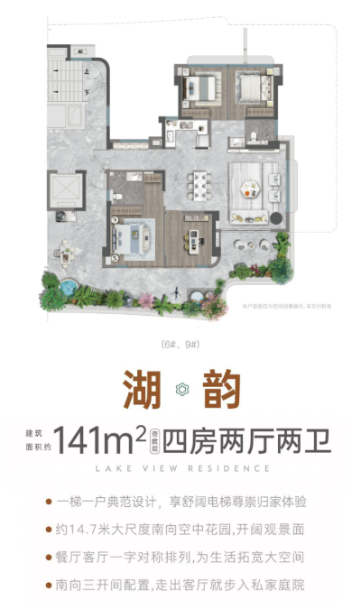 该户型通过66平米南北双阳台和通透的动线设计,将湖景资源引入室内。北阳台巨幕观景面与南阳台休闲区形成“北赏湖、南观园”的双重视野体系。