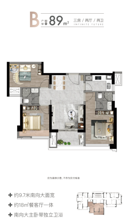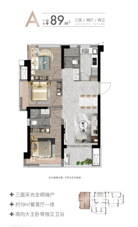 3室2厅2卫的89.00㎡户型:创新设计实现三面采光,得房率高达84%-92%,空间利用最大化