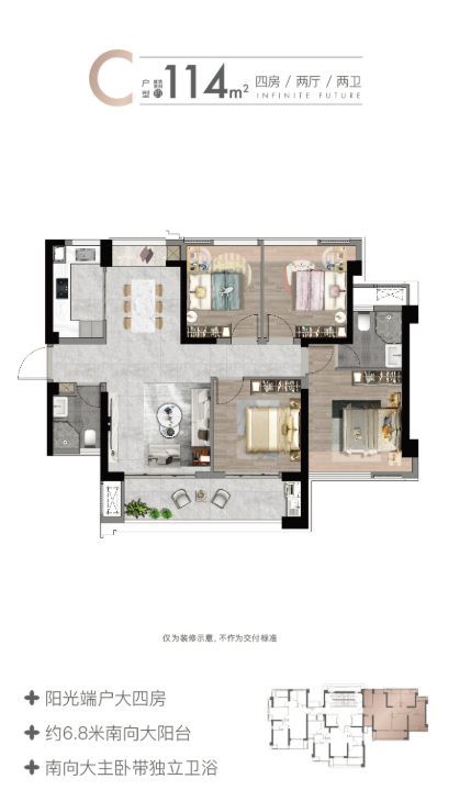 4室2厅2卫的114.00㎡户型:双套房设计,兼顾功能性与舒适度