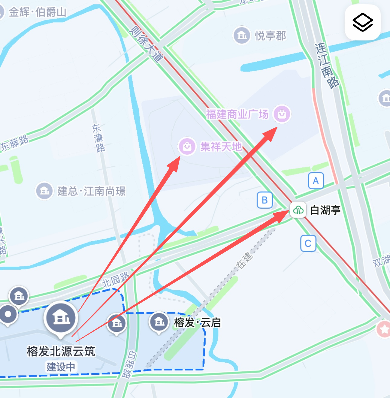 在区位方面,北源云筑地处南二环白湖亭核芯区,距离地铁1号线白湖亭站仅300米,步行约5分钟即可到达。周边商业配套丰富,直线距离约300米即达白湖亭万达广场,SM广场也在规划建设中。
