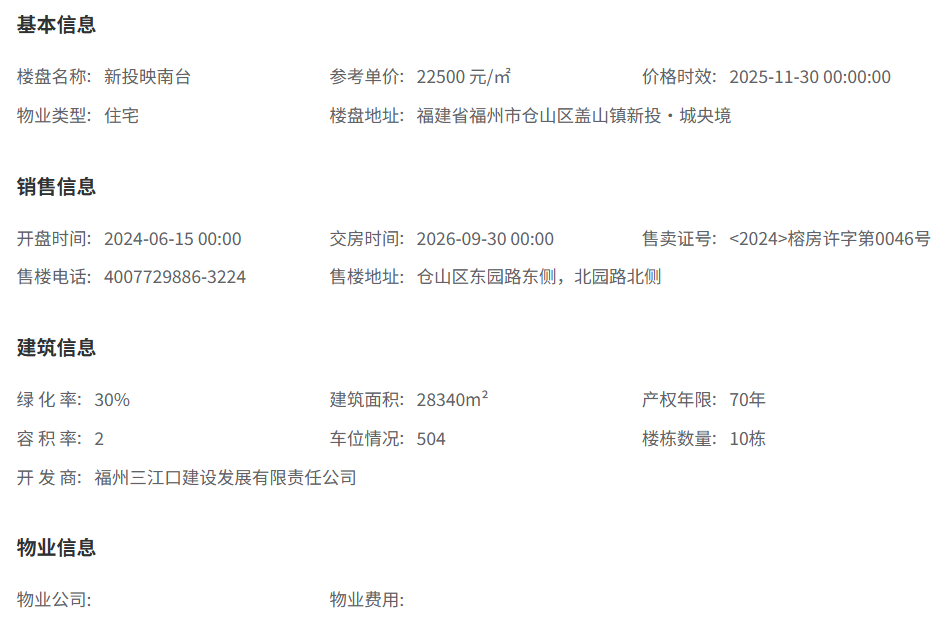 新投映南台由福建新投发展有限公司开发,作为福建省属国企,在福州开发过多个项目。