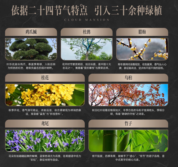 项目汲取老福州文化底蕴为骨,依据二十四节气不同特点,重金引入三十余种花木绿植,营造“五进礼序 九境园趣”的奢雅之境。