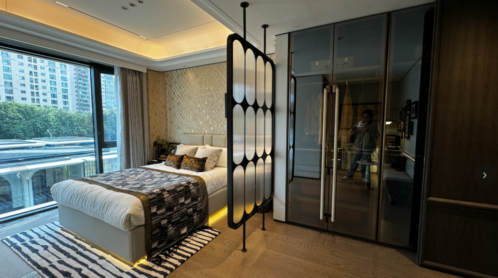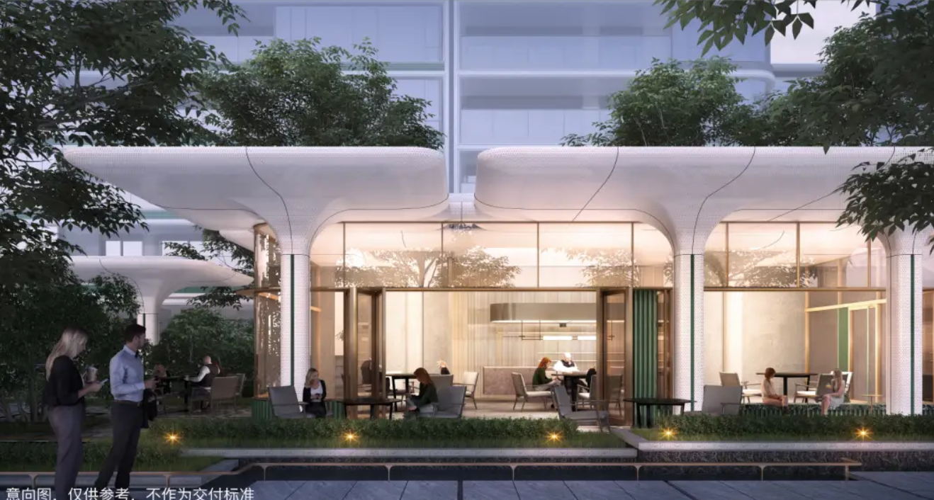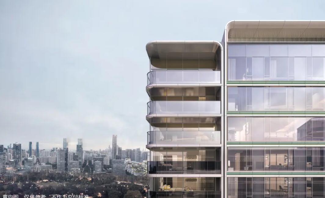 项目外立面采用270°曲面屏无立柱转角设计,将大面积蓝灰色LOW-E玻璃与浅灰色仿石铝板组合,形成极具辨识度的"芝蘭镜幕"。这种设计不仅从室内提供了无遮挡的广阔视野,从外部看也显得格外尊贵。