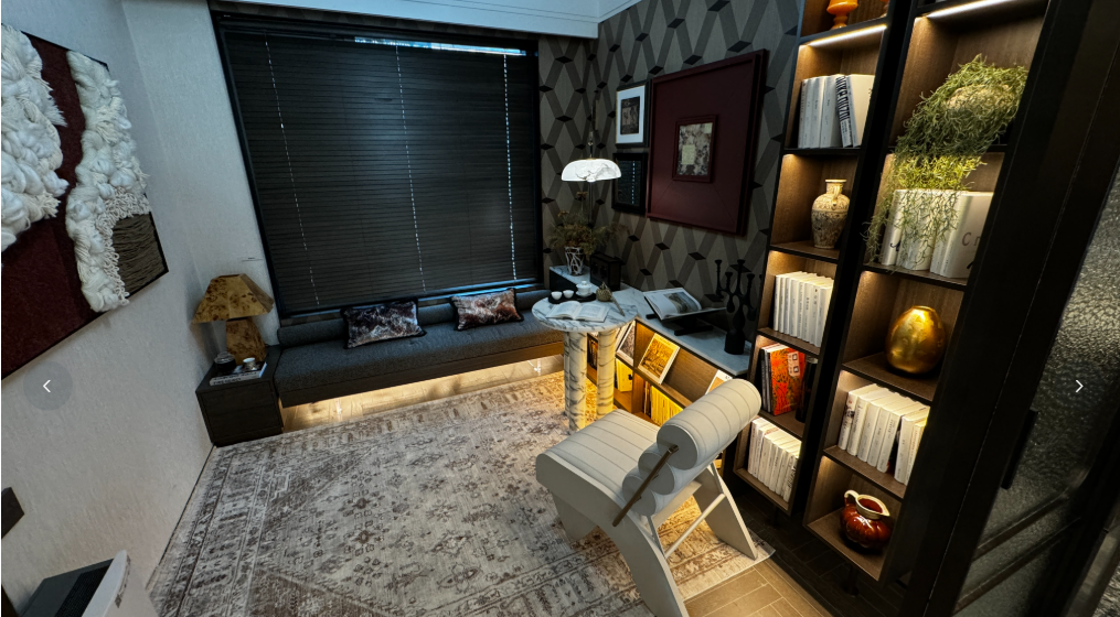 会所还延伸出一个谈心吧和下沉式图书馆,为业主提供了独处阅读与社交聊天的舒适场所。目前二展开放的无边际天幕泳池,曲线造型优雅,半圆卡座、弧形吧台的打造,让泳池更添灵动。