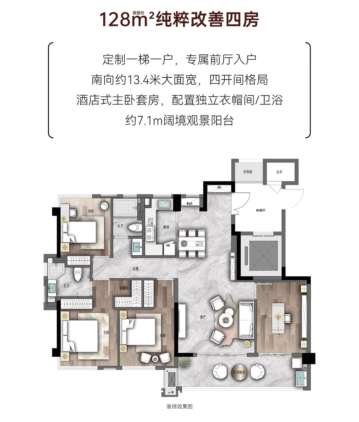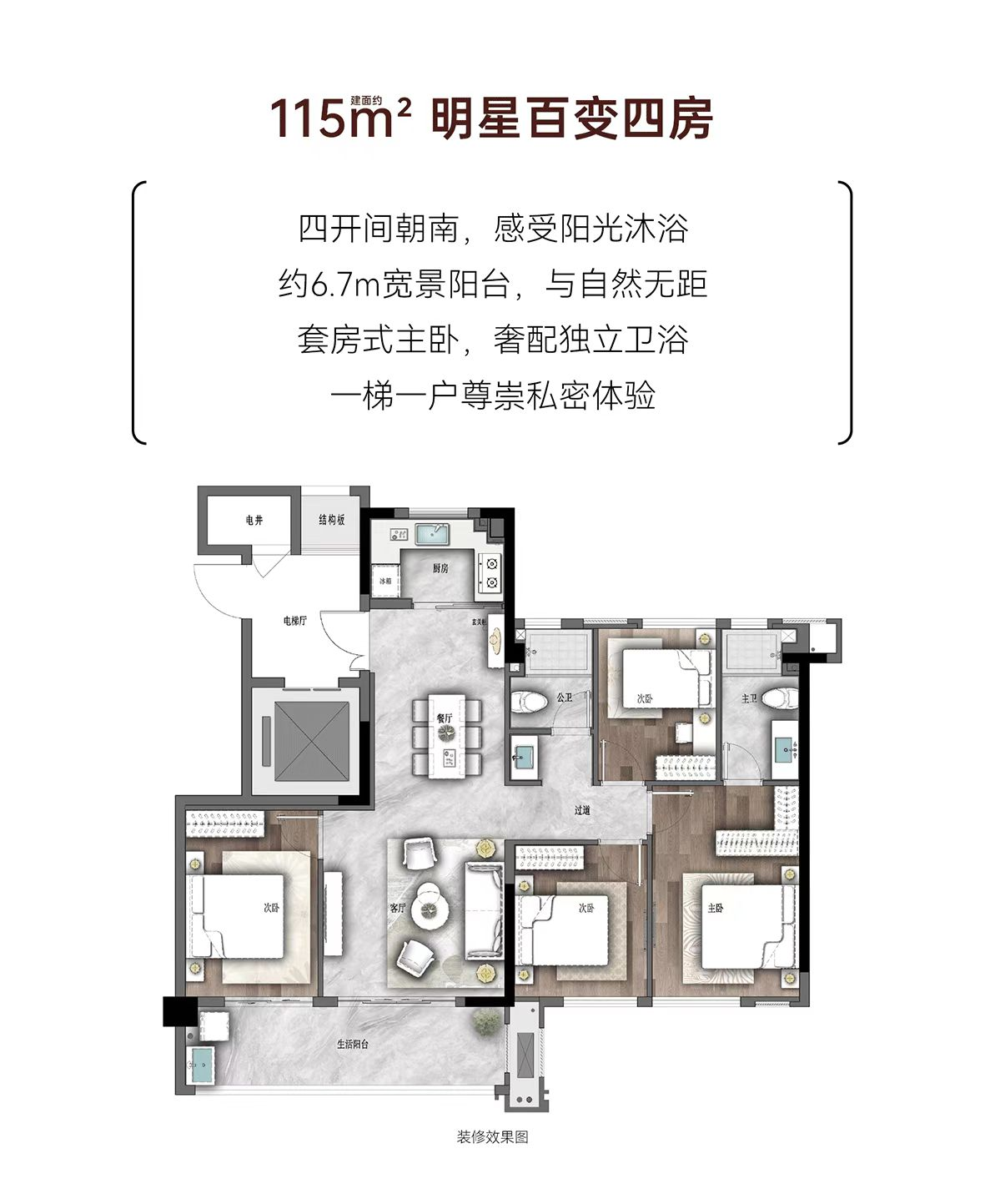 114平方米的四房两厅两卫户型,被项目定位为面向改善家庭的经典产品。这一户型获得了9分的综合评分,在空间、采光和通风方面表现均衡。