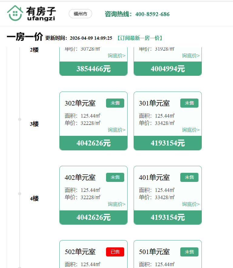 从一房一价公示信息来看,不同楼层的价格差异明显。以125.44㎡的户型为例,低楼层单元单价约30728元/㎡,中高楼层单元单价可达36728元/㎡以上,一房一价的具体数据已经可以在相关平台上查询。