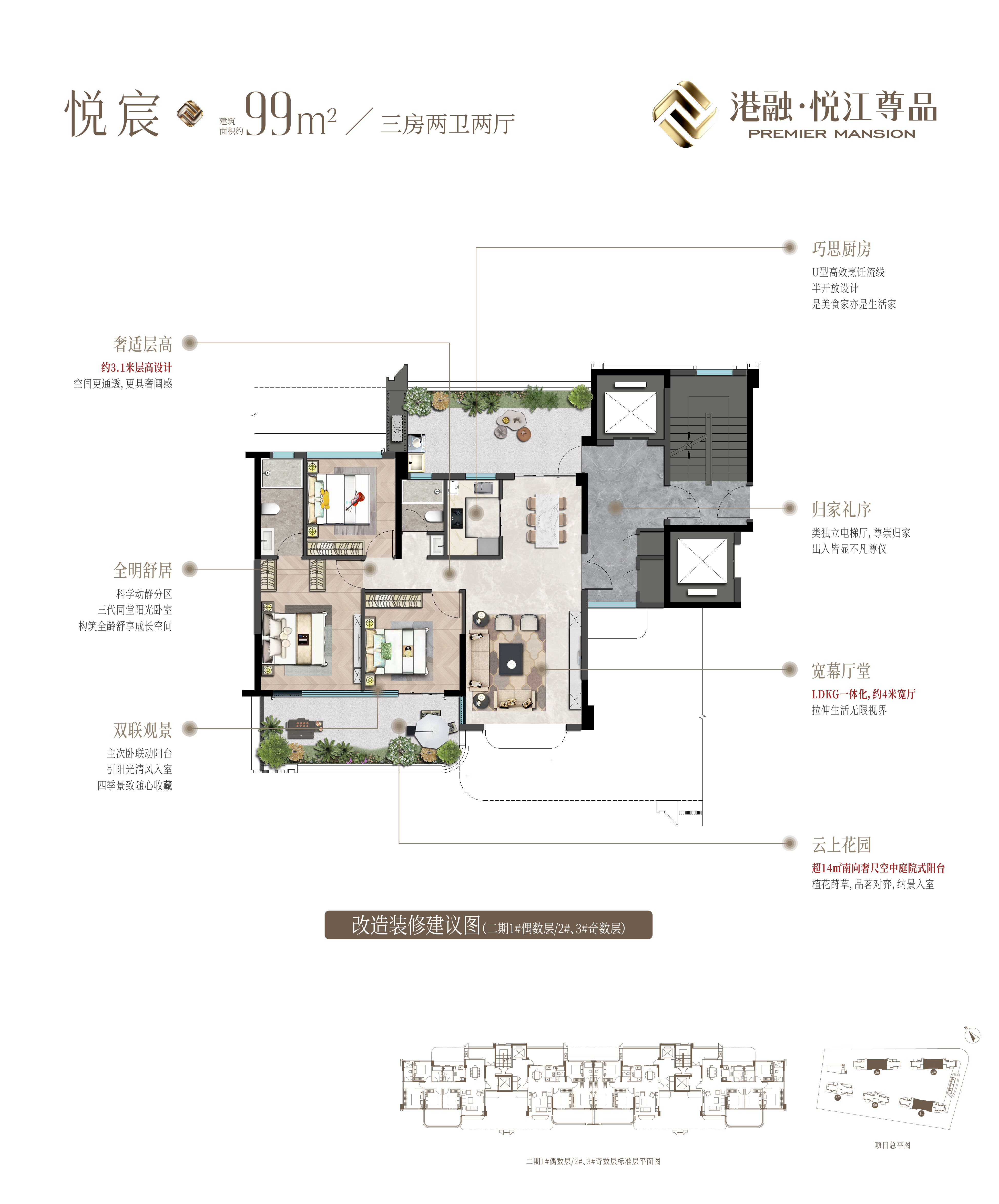 港融悦江尊品提供了丰富的户型选择,建筑面积覆盖约99至146平方米,涵盖了从首次置业到三代同堂的多元需求。主力户型为三室两厅两卫设计,建筑面积在120至140平方米之间。