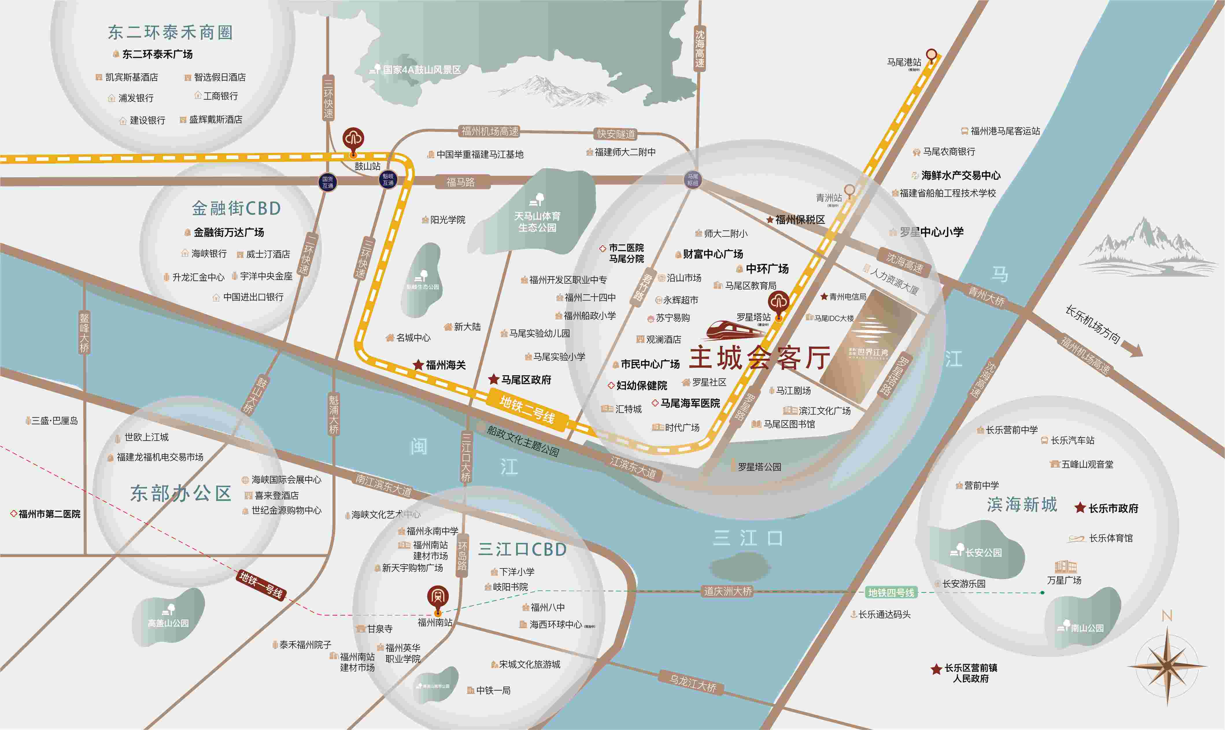 地铁2号线延伸线罗星塔站距离项目仅200米步行可达,周边交通四通八达,可以在10分钟内到达火车南站,30分钟内到达长乐机场,20分钟内到达台江万达。项目还快速连接宁德、南平、莆田、福清、平潭、长乐等县市,实现了全省范围内的畅通无阻。