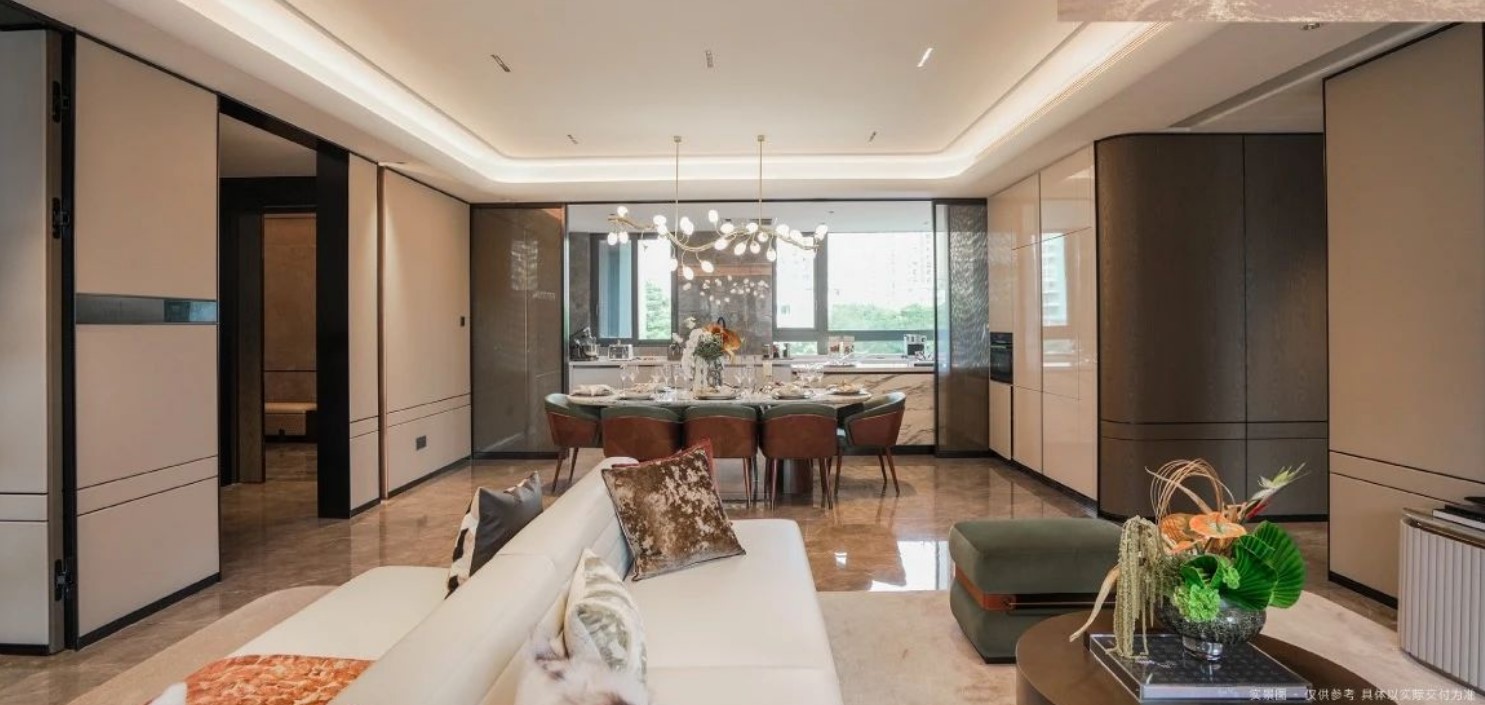 空间与舒适:宽境奢宅,生活的艺术 近3m宽的入户梯厅、3.15米高标准层高、全屋通顶门设计,以及约17.8米南向面宽,都展现了端礼著对于空间舒适度的极致追求。而约14米长的观景阳台和约80㎡客餐厨厅一体化空间,更是为业主们提供了一个可以享受家庭欢愉与朋友情谊的绝佳场所。