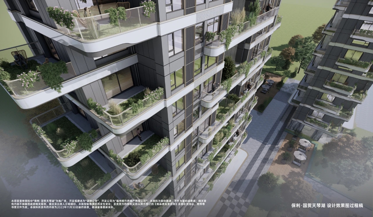第四代生态住宅的典范 在晋安湖CBD的核心地带,保利国贸天琴湖以其第四代生态住宅的身份,为城市最繁华之处框定出一隅宁静。这座住宅项目以一贯之的自然生态氛围,最终形成一座城市原生隐奢、和谐自然的气韵。 保利国贸天琴湖的设计理念源于对自然与现代化都市之间距离边界的消融。通过打破常规的建筑形态与空间规划、无遮挡楼宇布局,项目让摩登范的CBD建筑装饰在宛若大树般的自然住宅中,塑造出一种余韵悠长、互为风景对话的生活氛围。