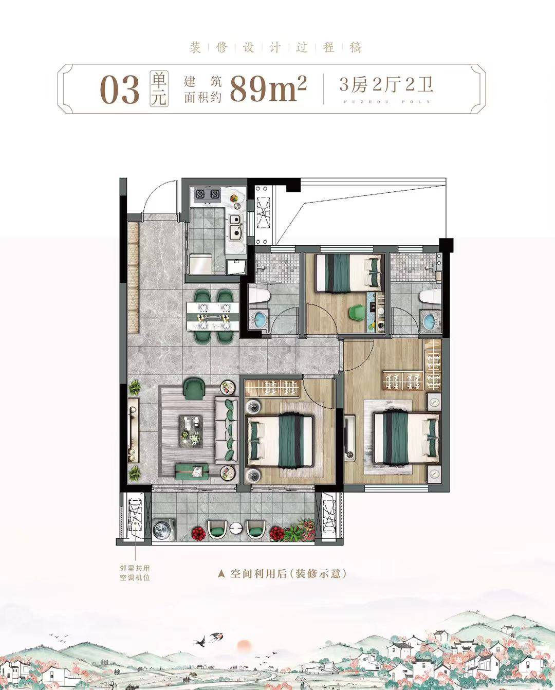 89㎡的住宅户型:精致空间中的品质生活 除了别墅户型外,保利和光屿湖还提供了89㎡的住宅户型。这款户型设置有三房两厅两卫,户型方正,南向三开间设计,采光充足。西区为动区,包括客厅、餐厅、厨房等;东区为静区,包括主卧、次卧等,实现了动静结合,区域功能性明确,互不干扰。从入户门到厨房、餐厅、再到客厅,动线明确且流畅。超长阳台连接客厅与一间次卧,采光充足,空间通透。主卧置于户型最里侧,空间宽敞阔绰,保证了住户的私密感,让您纵享品质生活。