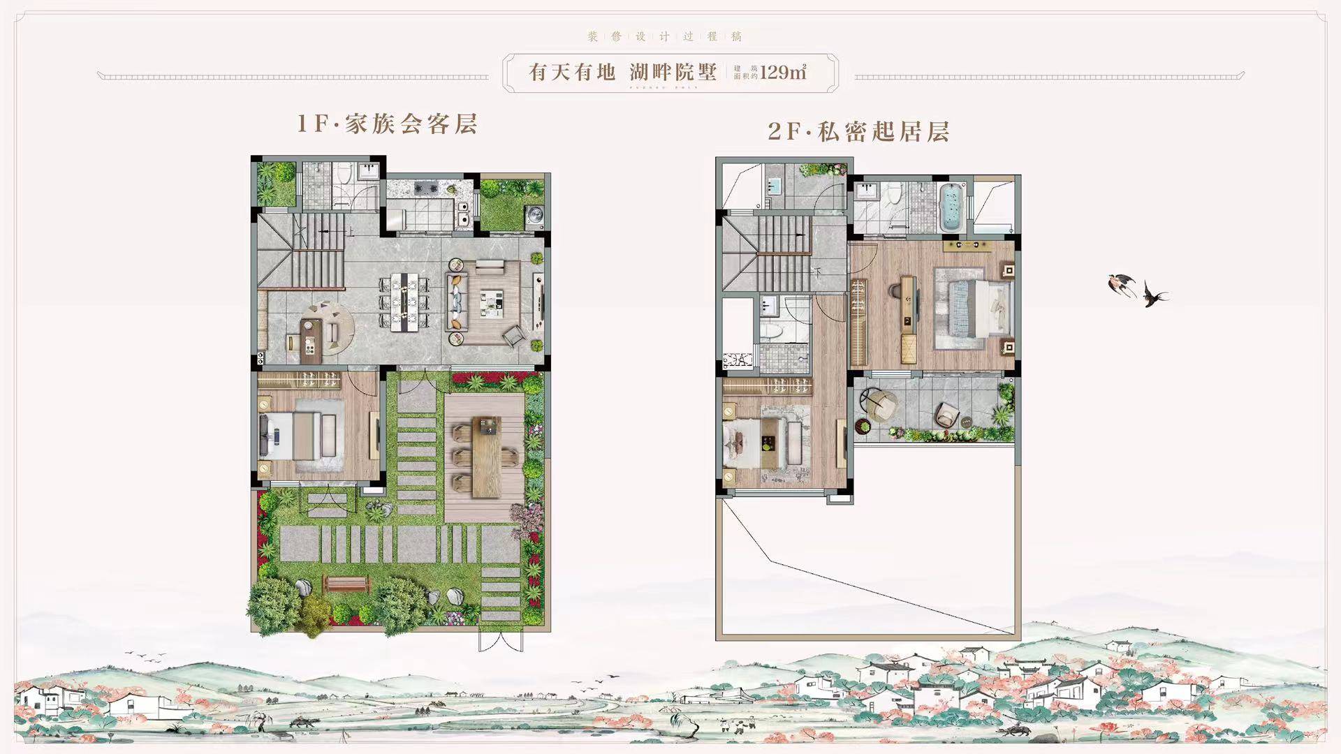 129㎡的合院商墅户型:尊享私密与舒适的完美结合 这款户型采用独栋双层设计,户内自带小花园,让住户在享受私密感的同时,也能拥有充足的活动空间。户型方正,结构合理,南北通透,通风极佳。南向四开间设计,确保了屋内充足的采光。此外,该户型上层为静区、下层为动区,实现了动静结合,区域功能划分明确,互不干扰。大开间客厅直接与餐厅、书房相连,与观景阳台相通,为会客区营造出极佳的空间感。主卧空间阔绰,配备独立卫浴及观景阳台,居住体验极佳。
