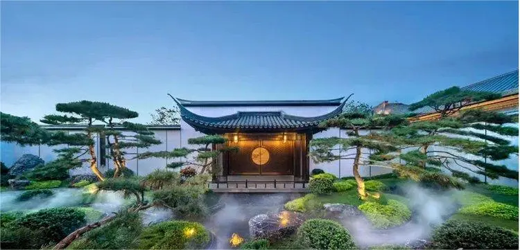 在景观设计领域,建发·灏云展现出了中式大宅的禅意精髓与现代建筑审美的和谐共融。从入口的“松风流庭”开始,高门阔府与云影青松相映成趣,屋顶的飞檐翘脊、石狮镇宅,以及罗汉松迎客、泉涌点缀等元素,共同营造出一种“河口听潮”的运河意境,使人身临其境,仿佛能聆听到历史的回响与故事的流转。