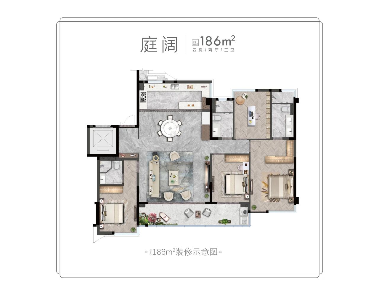 首开端礼著在户型设计上独具匠心,推出了建面约186㎡的奢装宽境平墅。这种设计将完善的功能空间集中于同一平面,通过大尺度的空间布局,为家庭成员创造了一个无界畅通的空中生活领域。约270°的窗景与3.15米的极致挑高,进一步拓宽了空间的视觉与感官体验,无论是家庭聚会还是个人休闲,都能在此找到完美的空间解决方案。