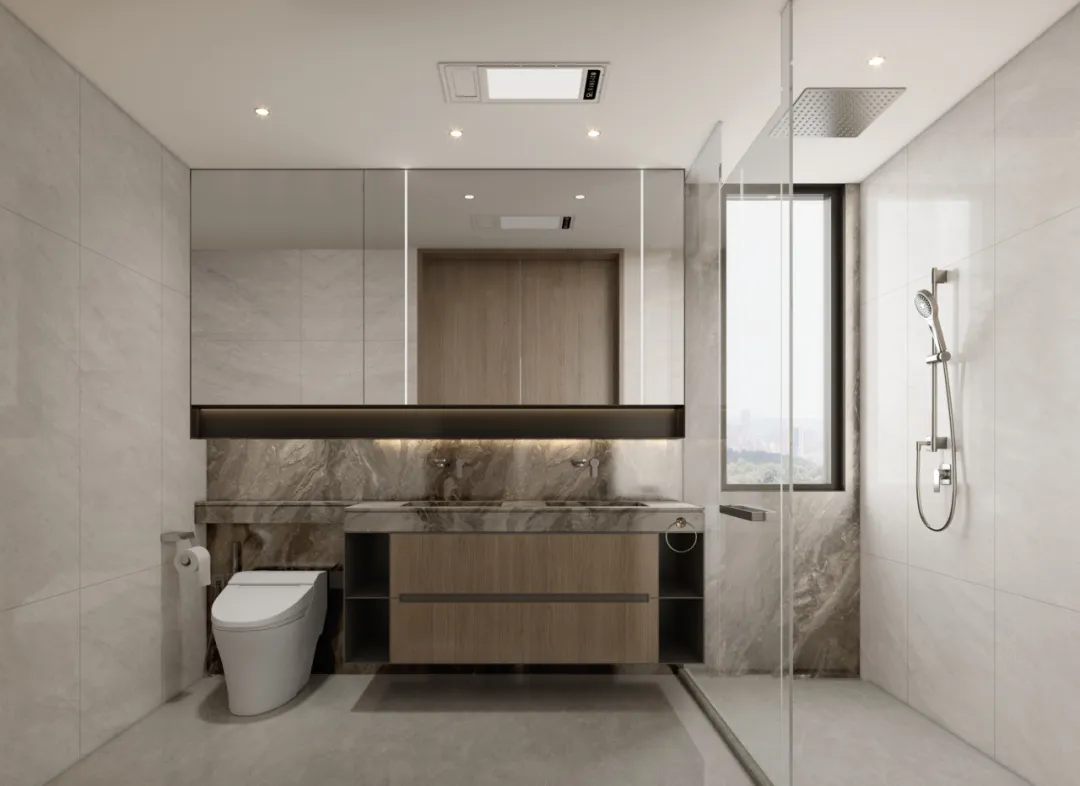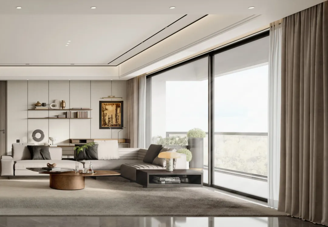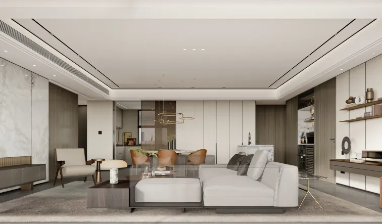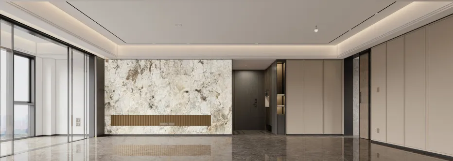 2. 审美引领: 项目精装设计由屡获国内外设计大奖的中国室内设计标杆团队——LSD操刀。设计师们遵循华林贵隐生活肌理,为华林雍璟奠定了以质感为先的静奢美学风格。通过多种材质的搭配和细腻的审美处理,如定制岩板的电视背景墙、大理石通铺的地面、木饰面与皮革硬包的墙面,以及高标墙布的全屋包裹,共同营造出一种静默而永恒的美感。