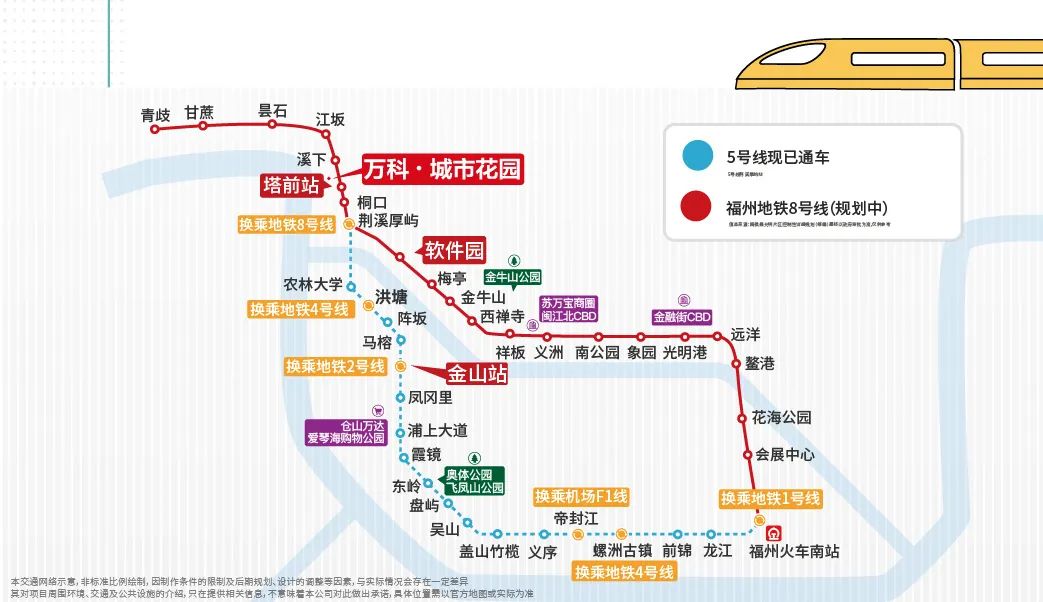 项目位于福州市杨桥西板块,地理位置优越,交通网络发达。双地铁交汇的设计(建设规划中)为业主提供了极大的出行便利。其中,8号线塔前站距项目仅约200米步行距离,未来出行将极为便利。此外,地铁5号线已于2022年上半年通车,串联起荆溪、金山、奥体至福州南站等重要区域,并可换乘多条已开通或在建的地铁线路,直达东街口、东二环、金融街等繁华商圈及机场,让业主的通勤与出行更加高效快捷。