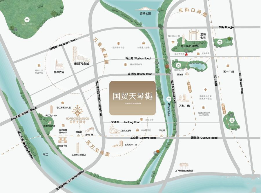 - 地段与景观优势:国贸天琴樾坐落于福州市政府旁,白马河畔,占据城市核心的绝版地段,地理位置得天独厚。周边有福州市民广场、闽江滨江公园等市政配套,形成超 20 万方的 “城市绿肺”,业主可尽享城市繁华与自然美景。相比之下,周边一些楼盘可能无法同时拥有如此优越的地段和稀缺的自然景观资源.
