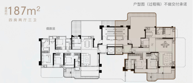 以 187㎡偶数层四房两厅三卫双空中花园户型为例 :