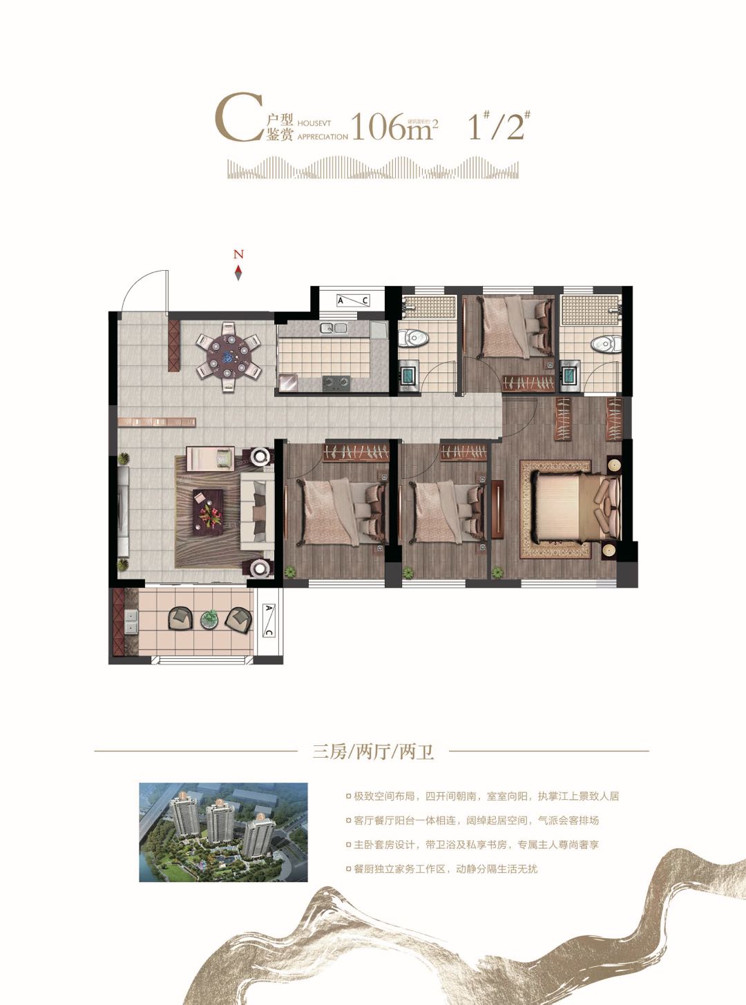 106㎡标准三房:四开间朝南,全明通透,客餐厅阳台一体相连,主卧套房设计,带卫浴及私享书房。餐厅独立家务工作区,户型布局动静分离。