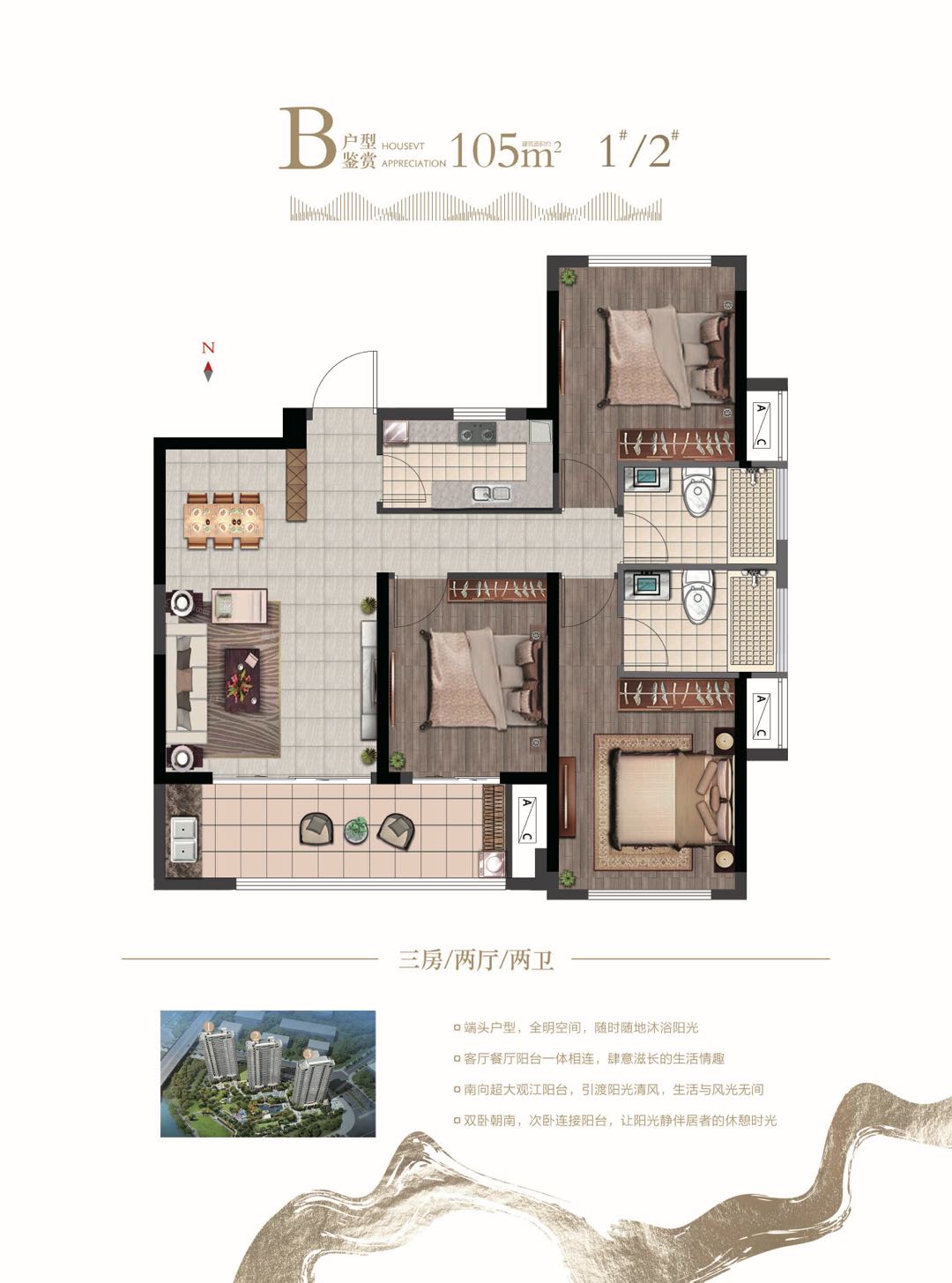 105㎡舒适三房:东头户型,全明空间,南向超大观江大阳台,双卧朝南,次卧连接阳台。整体布局方正,户型动静分离。