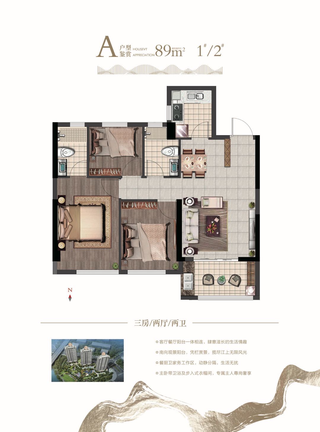 89㎡江景大三房:适合年轻家庭,客厅、餐厅、阳台一体设计,南向观景阳台可欣赏一线江景。独梯独户自带4平方入户花园,餐厨卫家务工作区,动静分离。