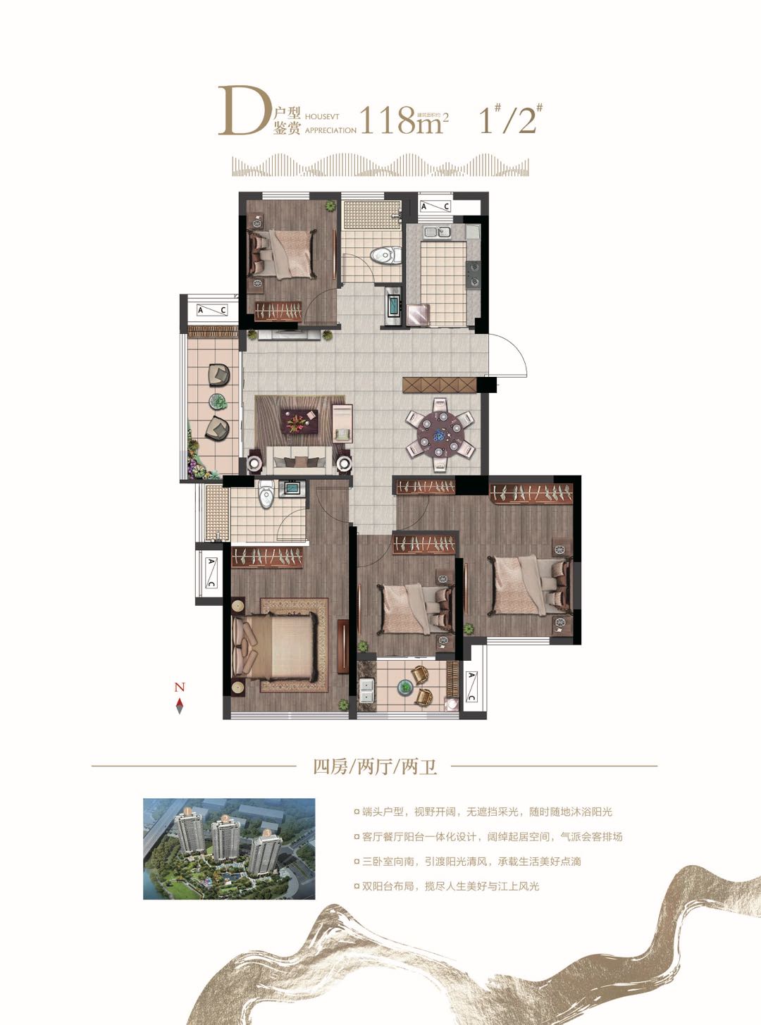 118㎡改善四房:端头户型,视野开阔无遮挡,客厅餐厅阳台一体化设计,三卧室朝南。双阳台布局,揽尽一线江景。