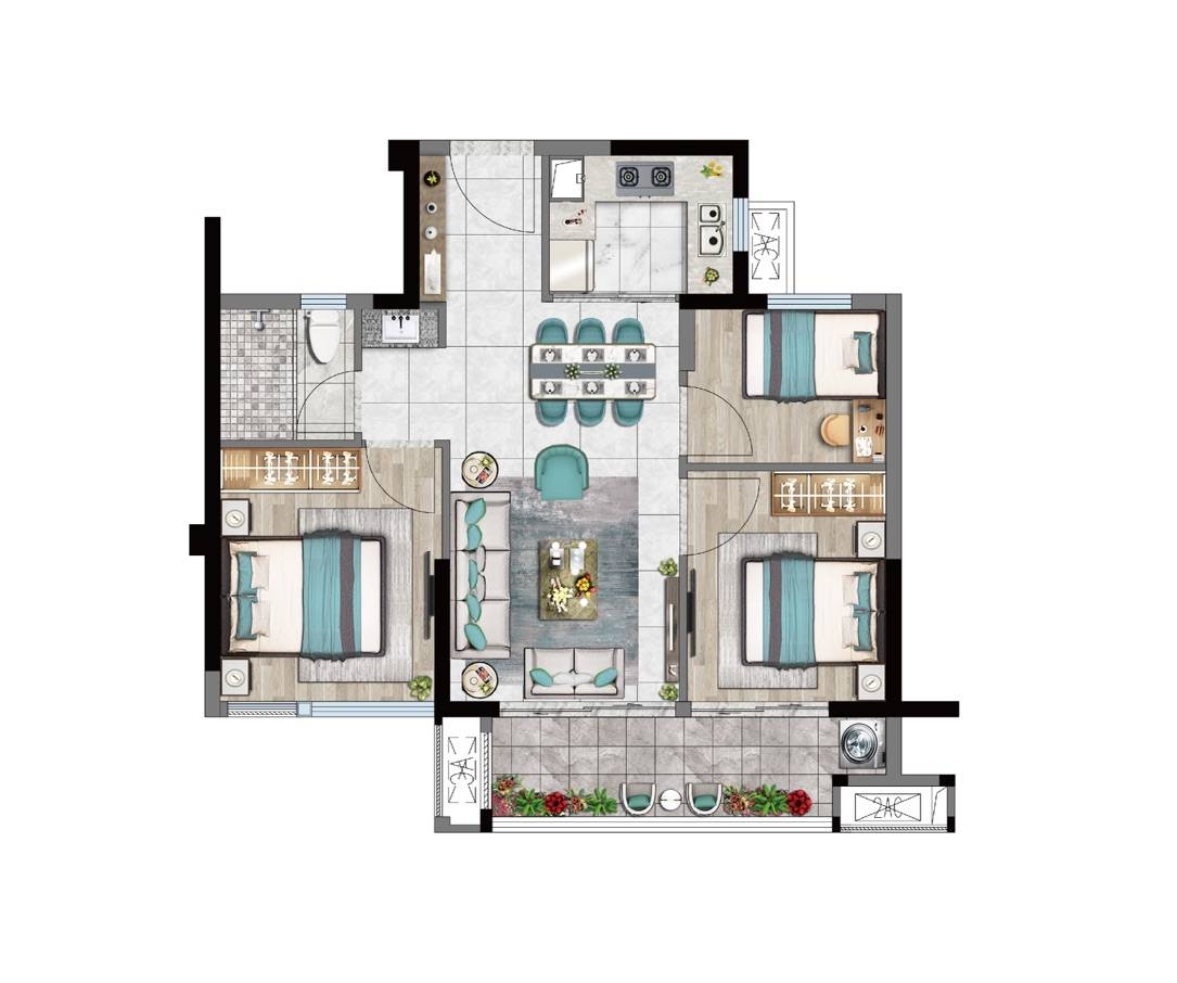 - 79㎡户型:三房两厅一卫一厨,格局方正,全明通透,三开间朝南,客餐一体化设计,双开间阔尺阳台,主卧套房设计,舒适贯穿日常起居。