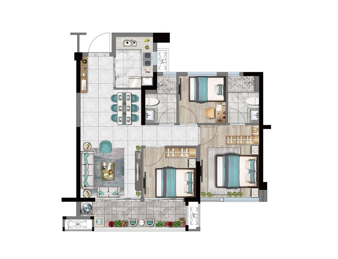 - 95㎡户型:三房两厅两卫一厨,方正通透,约5.3米宽幕瞰景阳台,联通式客厅,套房式主卧,专属盥洗室、衣帽间。