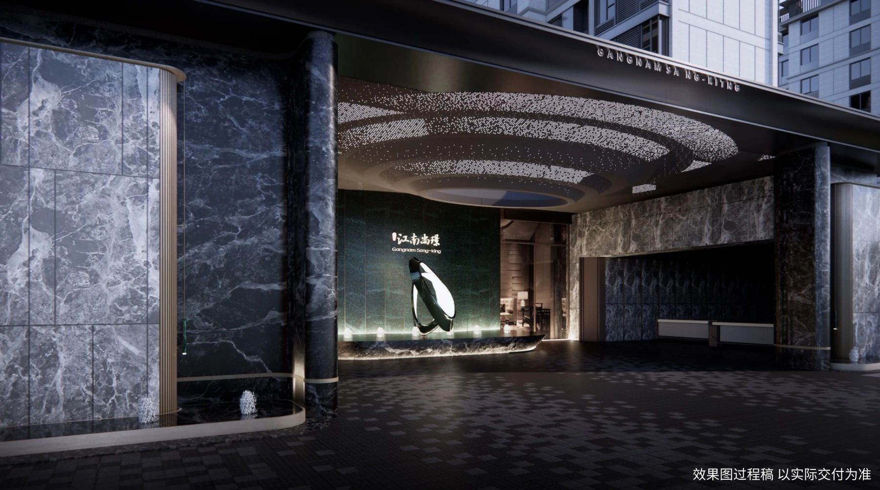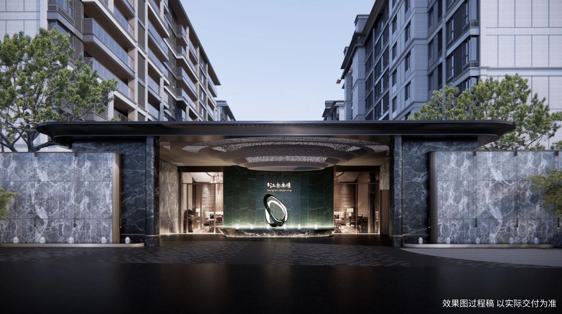 社区的西大门,作为此次实景呈现的第一大亮点,其设计灵感来源于世界顶级的超五星级酒店——华尔道夫。这种高定风格不仅仅是一种设计,更是一种态度,它将奢雅与高定的理念贯穿于每一个细节之中。升级后的西大门,采用了普拉达绿奢石、爱马仕灰大理石与范思哲黑皮革肌理大理石三种不同的奢石材质,这些材质的巧妙结合,不仅营造出了令人震撼的视觉效果,更体现了一种独特的艺术品味。