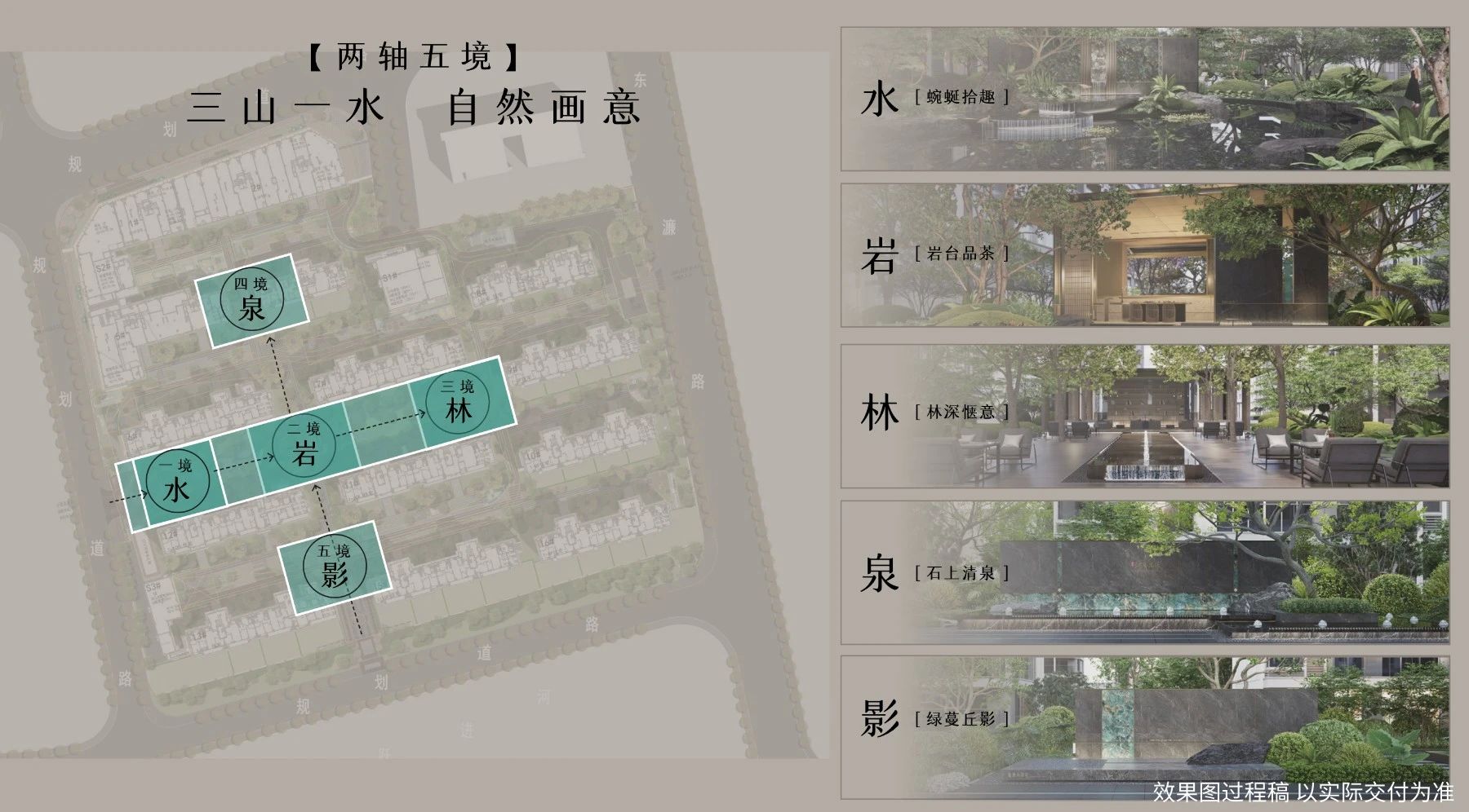 除了奢雅的门庭设计,社区的园林景观主轴同样是此次实景呈现的另一大亮点。这片园林不仅仅是一片绿色的空间,更是一种生活方式的体现。它通过一系列精心设计的景观元素,将生活场景串联起来,形成了一幅幅生动的画面,展现了洋房生活的诗情画意。