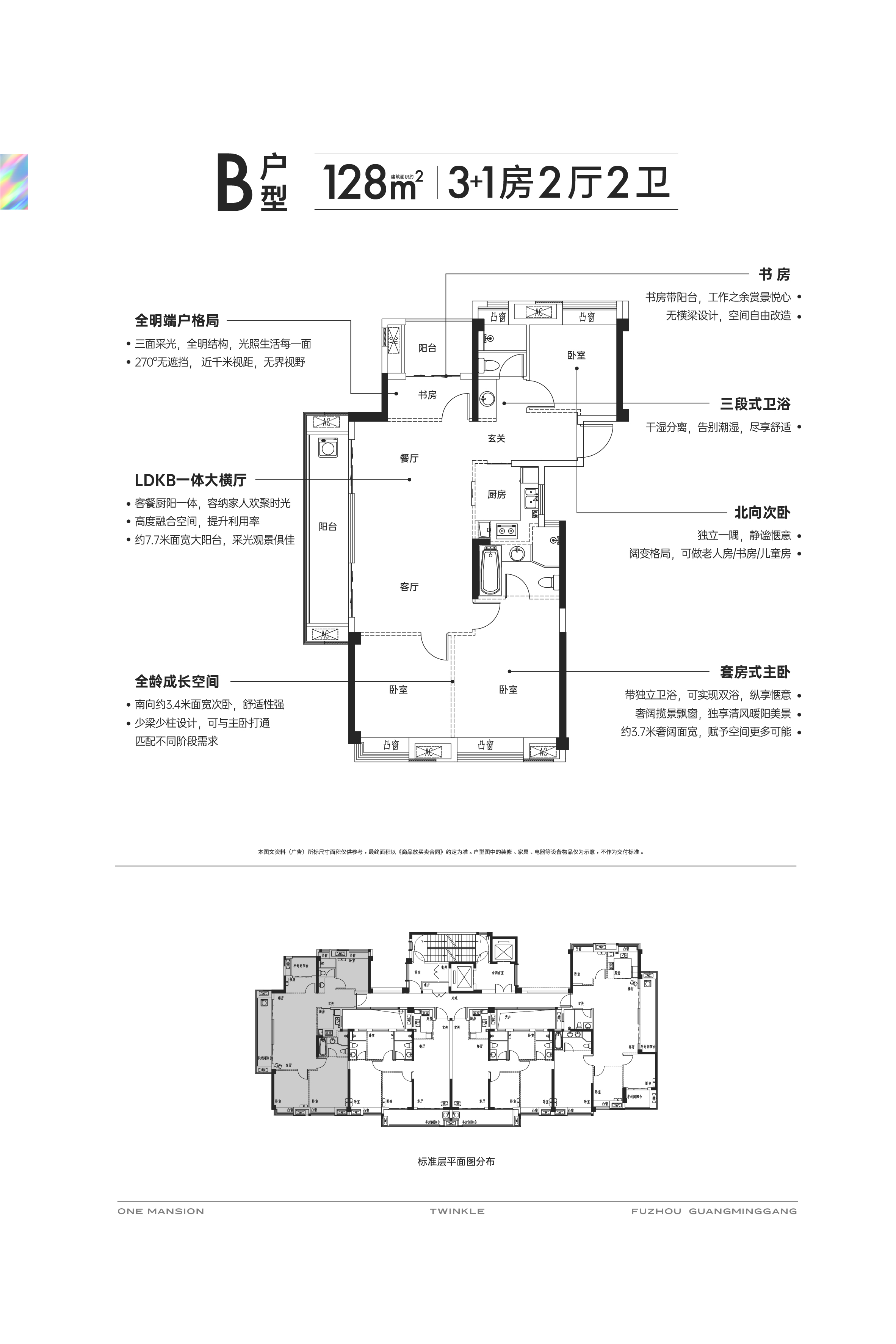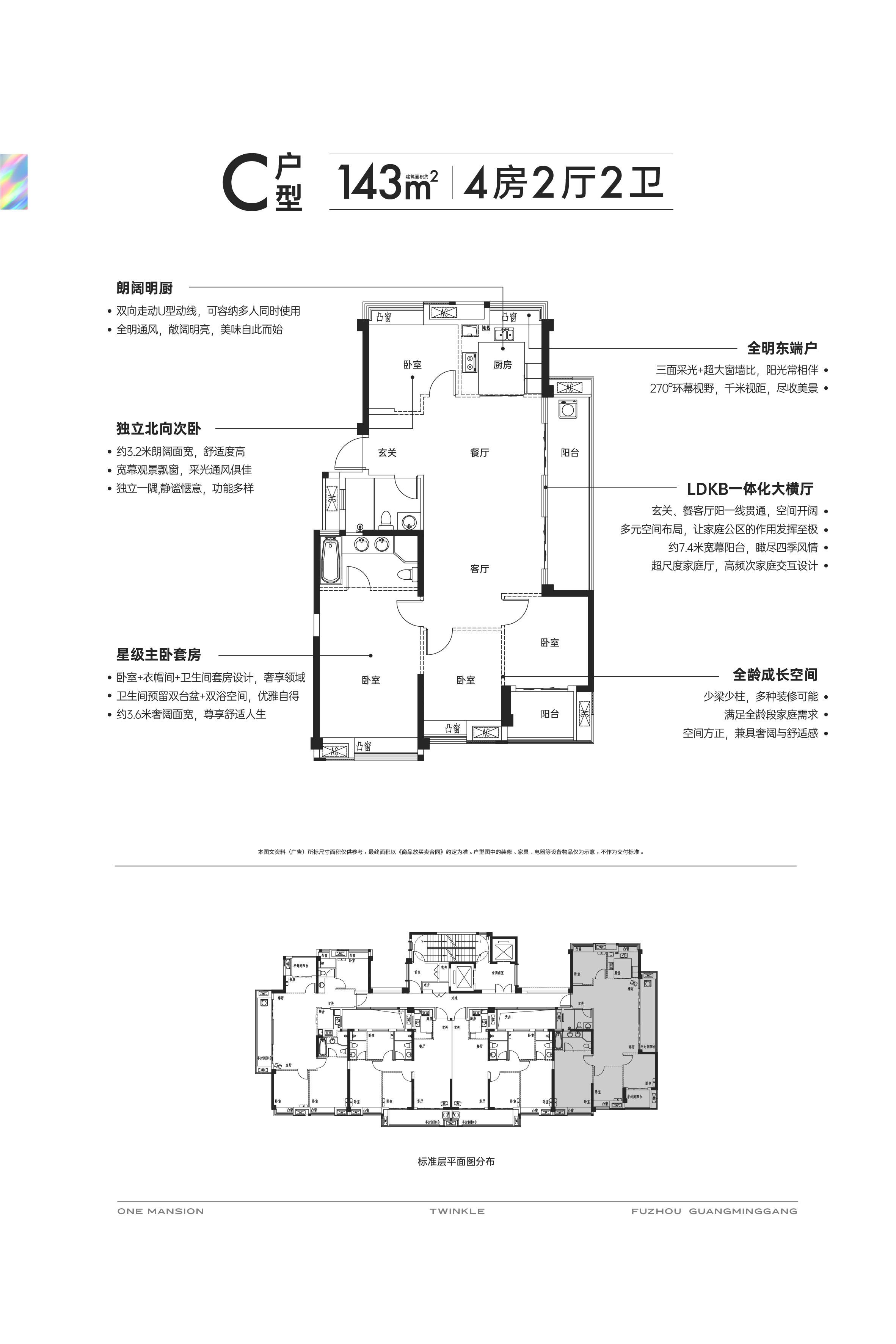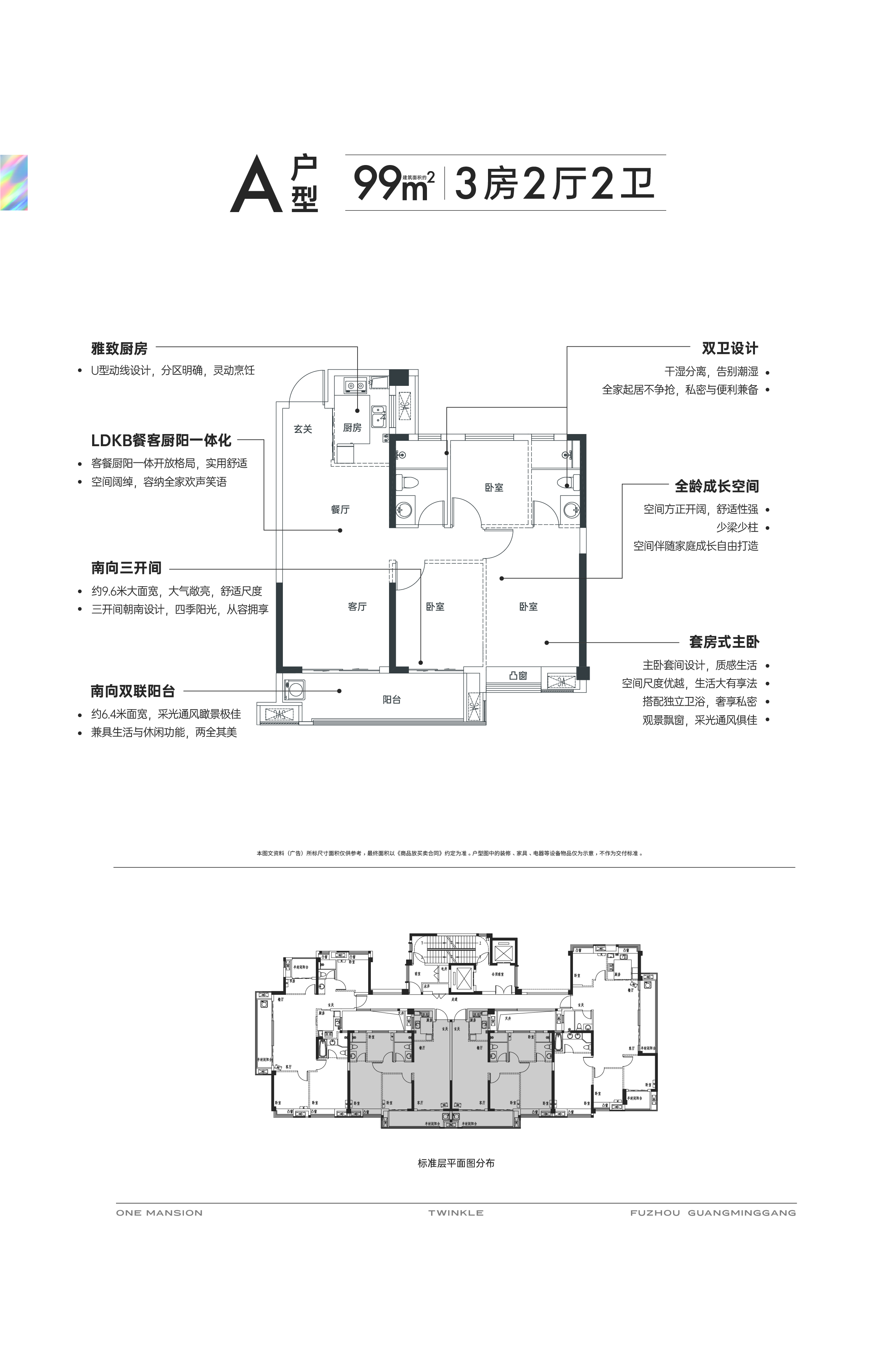 项目的户型设计强调宽屏大宅的概念,南向三开间的布局提供了约9.4米的大面宽,保证了充足的日照和通风。LDKB一体化设计将客厅、餐厅、厨房和阳台融为一体,形成了宽敞明亮的生活空间。