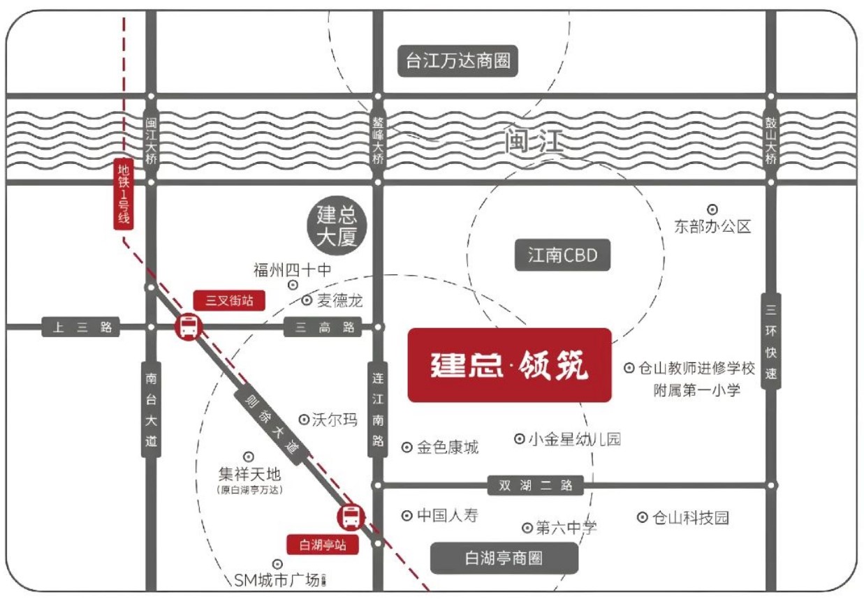 建总领筑位于福州仓山白湖亭高坂路9号及7号,处于二环的核心位置,临近江南CBD区域。这个地段的优势在于: