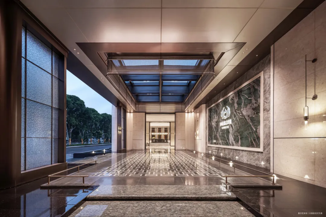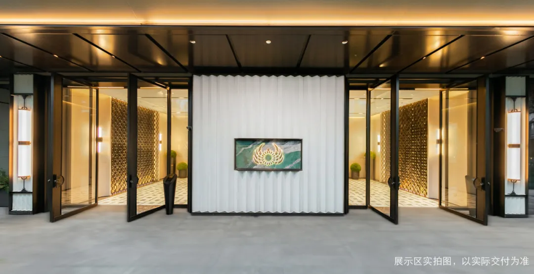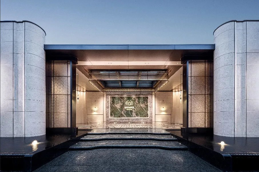 项目在建筑美学上追求简洁的几何体量与卡地亚美学色系的强烈对比,辅以艺术奢华的百达翡翠奢石背景墙,展现出隽永的经典美感。进入艺术酒店式的礼悦门厅,九级雅阶引领视线至流沙棕奢石背景墙,艺术铜板画的融入更添气势与艺术气息。