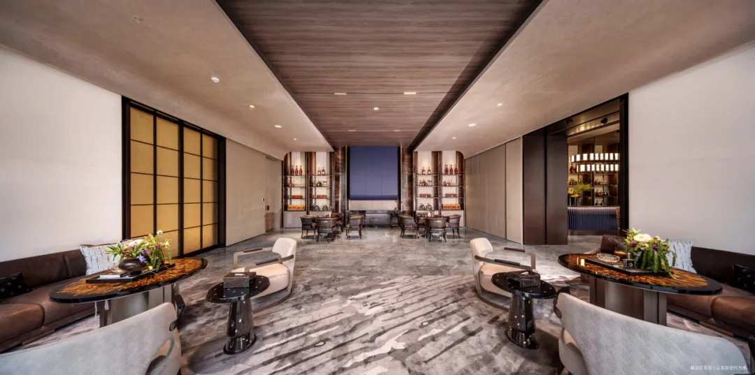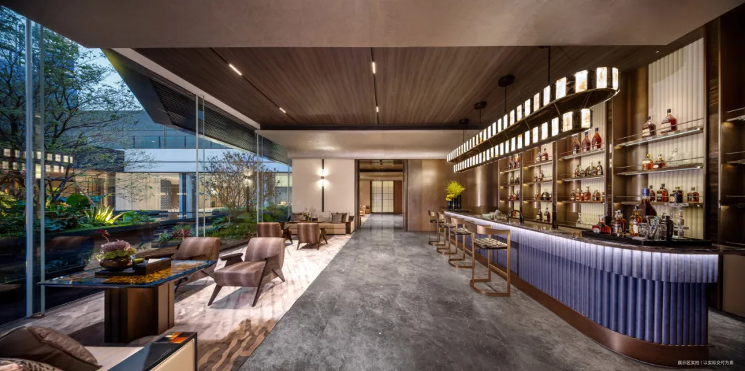 会所内部高通透的立面实现视线的自由延伸,室内空间与外部景观宛若无界交融。会所接待门厅采用巴尔塞绿奢石,其鲜艳独特的色彩在灯光下璀璨夺目,兼具鲜活生命力与沉稳气质。