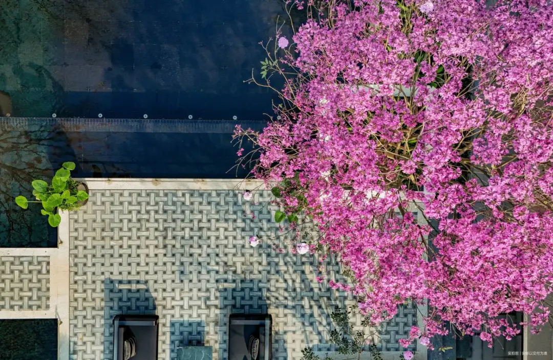 项目景观设计强调内外空间的连续性,通过两列紫花风铃木延伸视线,水上平台与自然交织,营造出度假般的氛围。下沉平台采用圣诞米黄大理石花池,搭配南方热带植物,提供独特的休憩空间。