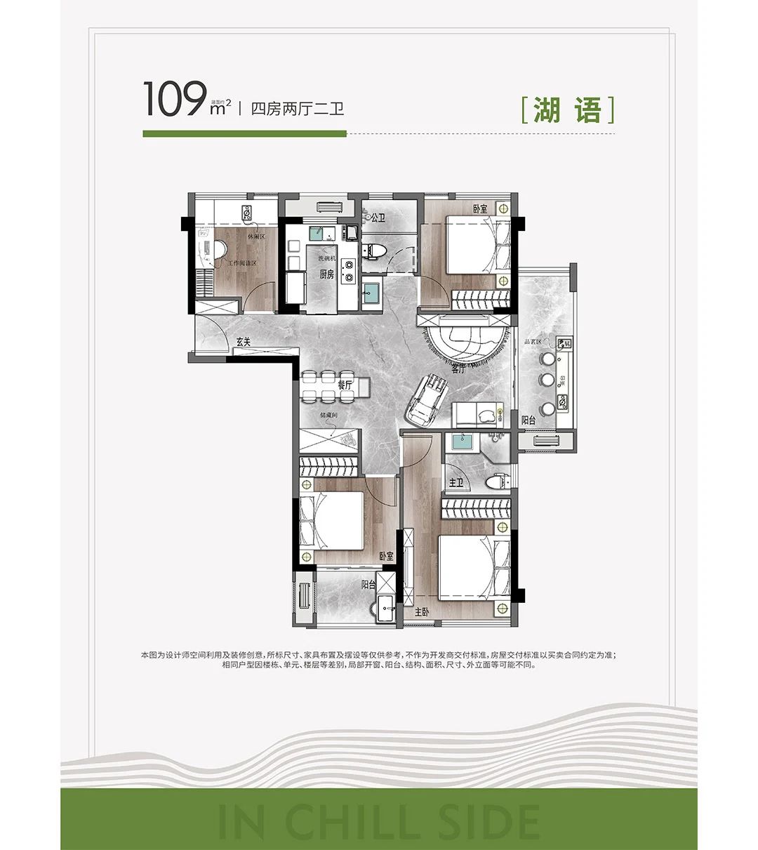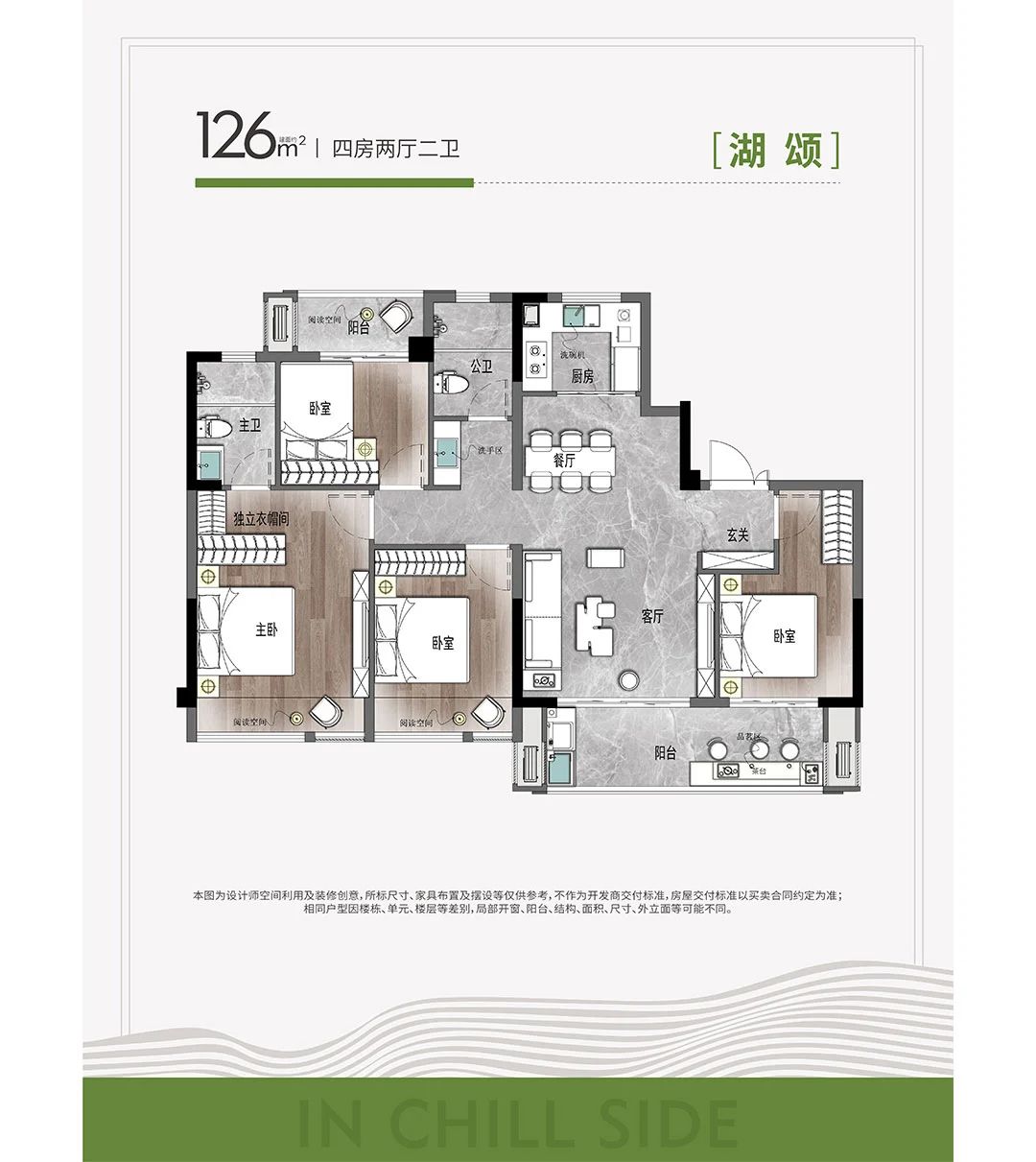 湖颂:四房两厅两卫户型,端户方正四房设计,适合二胎或三代家庭。南北双阳台设计不仅提供了观景的绝佳场所,也增加了品茗等休闲活动的空间。