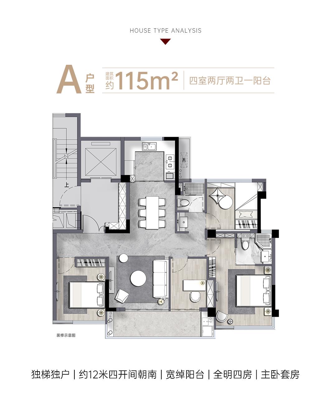 - 115㎡户型:三房两厅两卫,独梯设计。客厅为开放书房的横厅设计,视觉效果好,但卧室空间实际为 2.5 房。