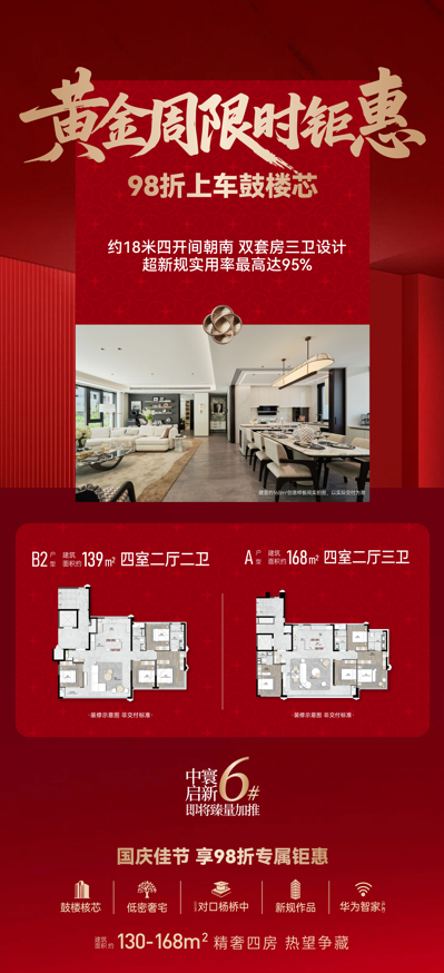 主力户型包括130㎡四房两厅两卫、139㎡四房两厅两卫和168㎡四房两厅三卫,每种户型都经过精心设计。其中168㎡户型采用双主卧套房设计,配备独立电梯厅,私密性与舒适性兼具。而130㎡户型则采用南向3开间设计,适合二孩家庭的需求。