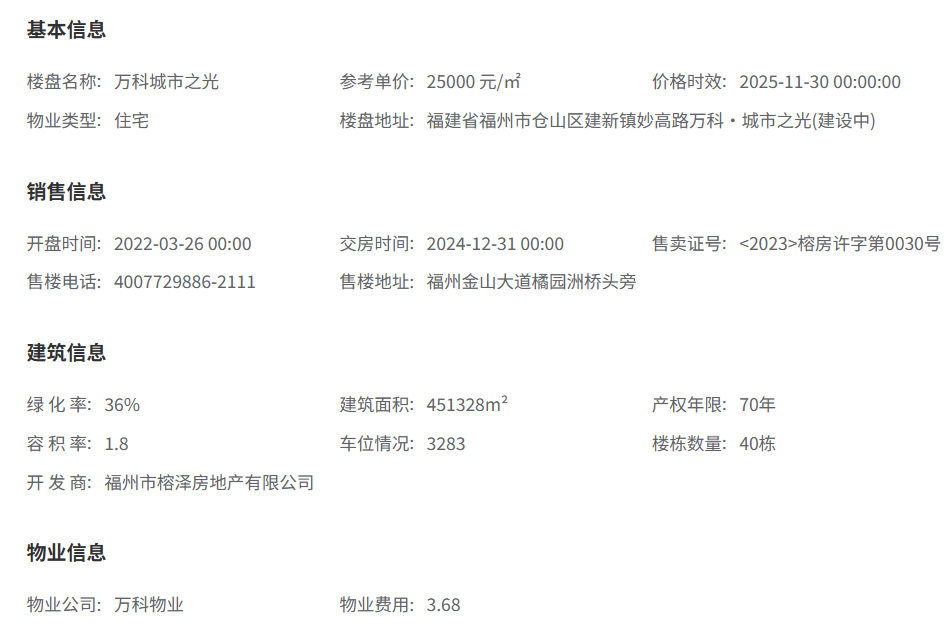万科城市之光由福州市榕泽房地产有限公司开发,万科品牌作为国内房地产行业的领军企业,始终以打造高品质住宅产品著称。这一项目位于福州主力发展板块之一——仓山金山片区,具体地址在金山大道橘园洲桥头旁(三环辅道右转三百米),地理位置优势突出。