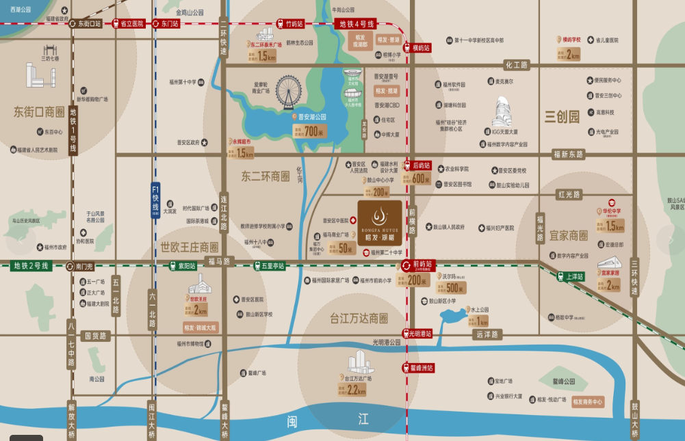 榕发·湖樾的最大亮点在于其稀缺的地理位置。项目直距晋安湖仅约700米,使业主可轻松享受湖滨公园带来的自然生态与休闲配套。