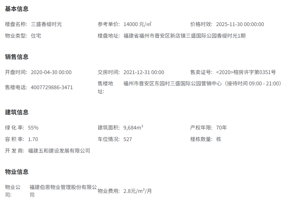 三盛香缇时光的开发商是福建五和建设发展有限公司,物业管理由福州伯恩物业管理有限公司负责。